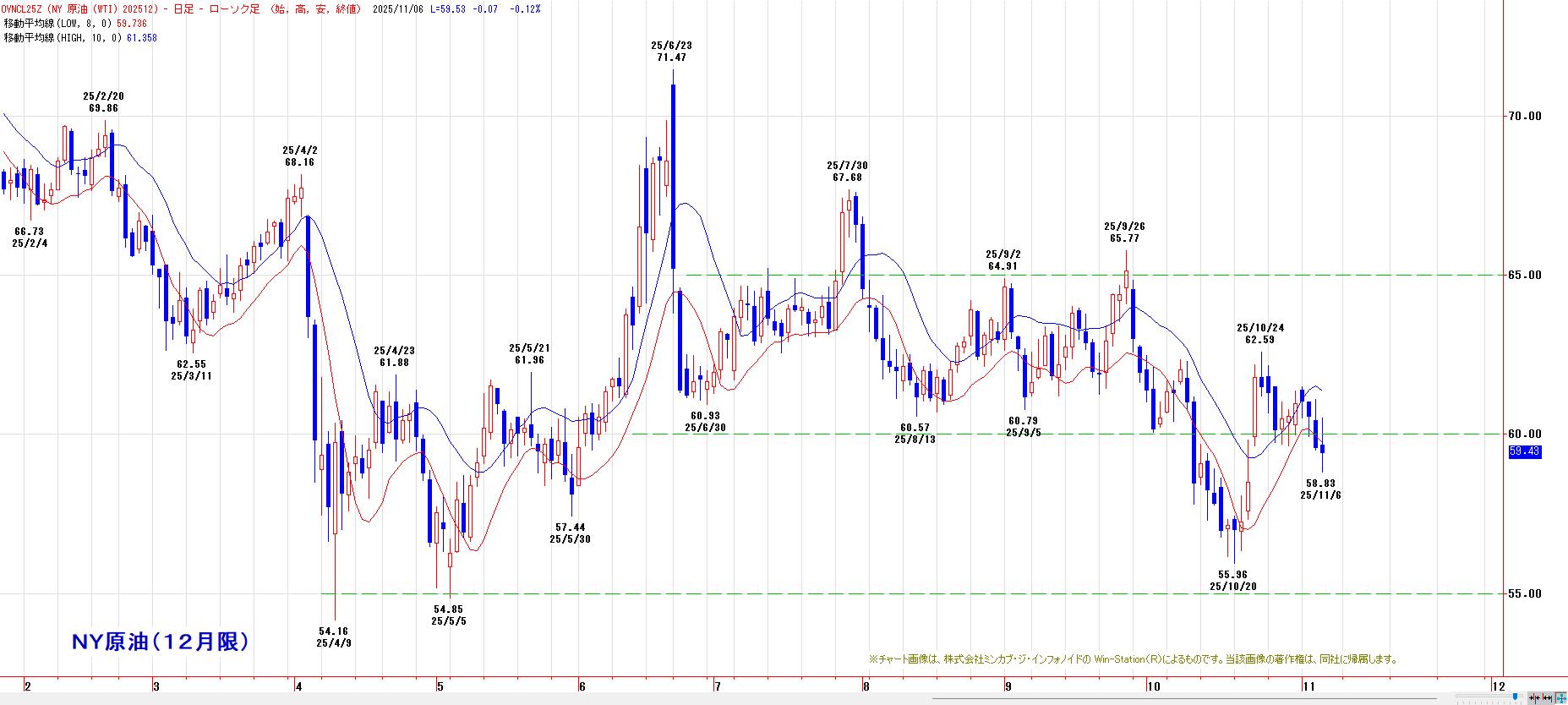 昨晩のNY原油(12月限)は、3日続落した。前日比0.17ドル安の1バレル59.43ドルで終えた。