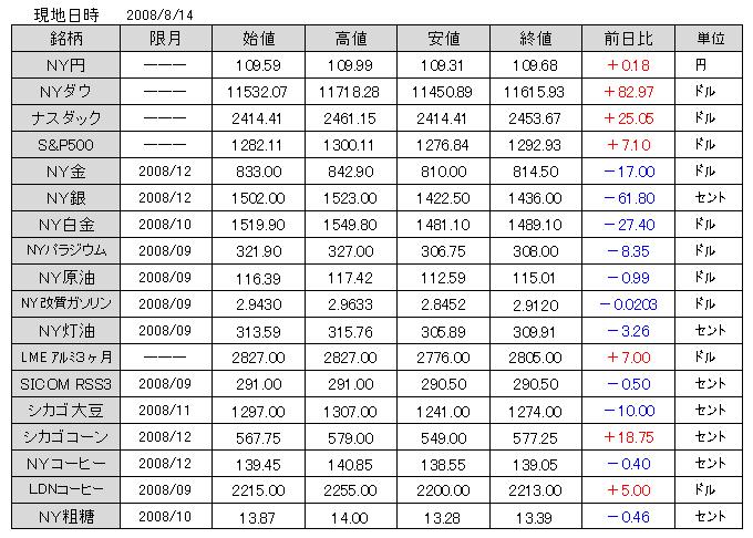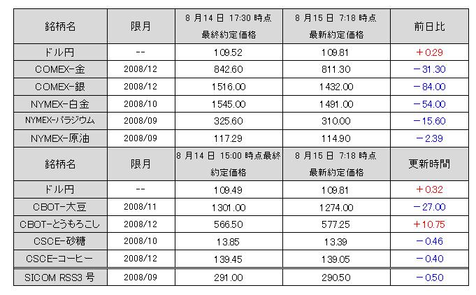 2008/08/12 オーバーシュート待ち 本日の国内市場は、金のS安を始めとして全面安の様相。今年も荒れる八月となっている。お盆期間で薄商いの中ではあるが、17日の満月前後の金・白金の安値は、中長期的な買い場になるか?ただし、値頃ではなく、チャートパターンでの参入と、ストップロス水準は明確に決めてのエントリーを。 国際エネルギー機関(IEA)月報では、2009年の世界石油需要見通しが上方修正された。北京五輪後に、中国の原油消費が拡大するとの見方を示している。