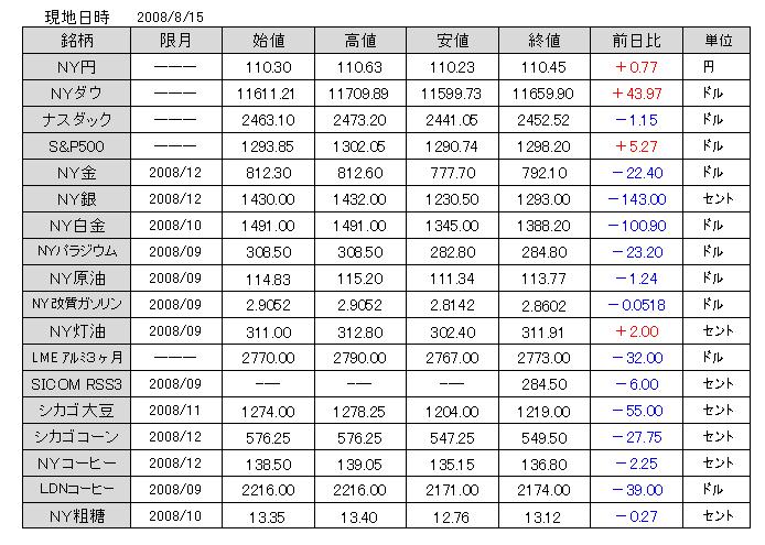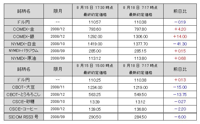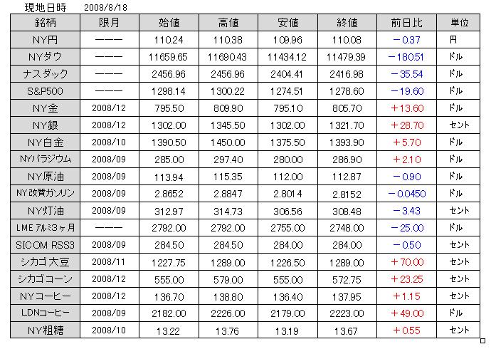2008/08/19 メルトダウン 本日の国内市場は、夜間続落を受け、投げが投げを呼ぶ展開。上昇過程では、踏みが踏み上げを呼んだ格好だが、今は正反対の展開。 上げも行き過ぎだったが、下げも行き過ぎとなれば、その反動も出てくる。金に関しては、「ファンド売り・実需買い」の構造に変化しつつある。トレンドが明確に発生しており、安易な値頃は持つべきではないが、中長期スタンスからは、オーバーシュート気味に売り叩かれた銘柄に対して、買い場を探る戦略で良いのではないか ?