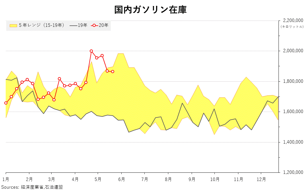 2020/05/27 石油連盟週報(17〜23日) ガソリンの週末在庫は、前週比0.2%減の186万4076キロリットル。 灯油在庫が6.5%増の165万1743キロリットル。 週間原油処理量は、8.7%減の219万8148キロリットル。 推定出荷量は、 ガソリンが9.3%減の67万3039キロリットル。 灯油が67.6%減の7万2582キロリットル、 「旗は鳴る鳴る ラッパは響く」カテゴリの最新記事 < 前の記事次の記事 >