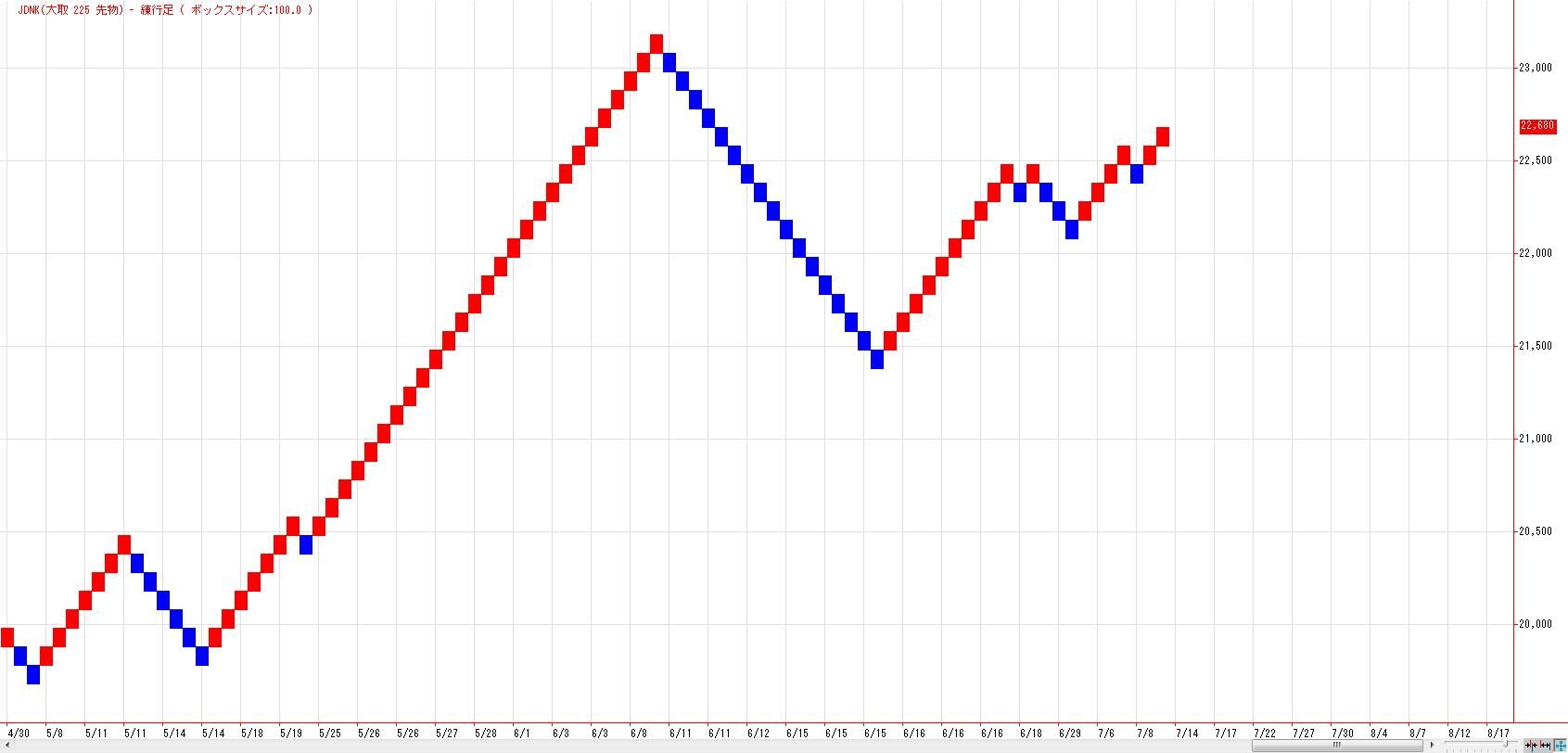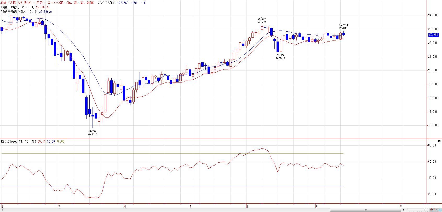 2020/07/14 日経225(チャート分析) 本日の日経225は、反落。MACでは、売り・買い共にシグナルなしの状態。終値ベースで、LMA(22300円)〜HMA(22590円)のレンジ放れ待ち。 心理的節目23000円が上値抵抗。基準線〜転換線が下値支持帯として機能中。三角もち合い放れ待ち。 練行足は陽転継続。 「チャートワンポイント」カテゴリの最新記事 < 前の記事次の記事 >