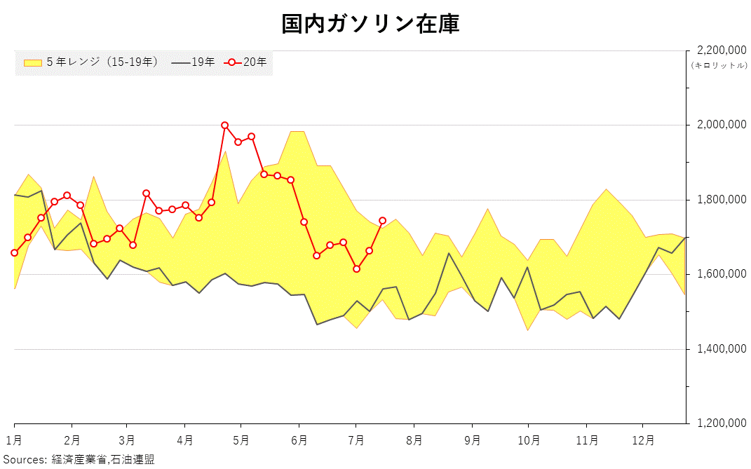 2020/07/22 石油連盟週報(7月12〜18日) ガソリンの週末在庫は、前週比4.9%増の174万4497キロリットル。 灯油在庫は3.9%増の185万6287キロリットル。 週間原油処理量は、1.7%増の234万4231キロリットル。 推定出荷量は、 ガソリンが5.9%減の73万6423キロリットル。 灯油が25.1%減の7万3680キロリットル。 「旗は鳴る鳴る ラッパは響く」カテゴリの最新記事 < 前の記事次の記事 >