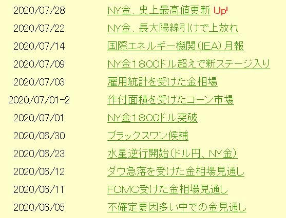 2020/07/28 NY金、史上最高値更新 お客様メニュー「市場分析レポート」で 「NY金、史上最高値更新 」を更新してあります。 参考にして頂ければ幸いです。 これまでのレポートで指摘したような展開が続いています。 短期的には、本日の東京市場での上ヒゲ十字線で、調整も入りそうですが、大きな流れでは、大統領選挙前の9月には、一波乱ありそうなスケジュール感となっており、調整後は改めて押し目を買い直されそうです。 9月の波乱要因は、明日のTV(STOCK−VOICE)でお話しできればと思います。 「旗は鳴る鳴る ラッパは響く」カテゴリの最新記事 < 前の記事次の記事 >