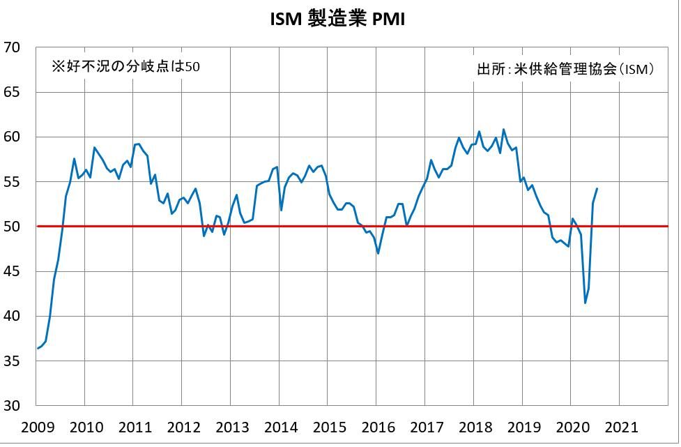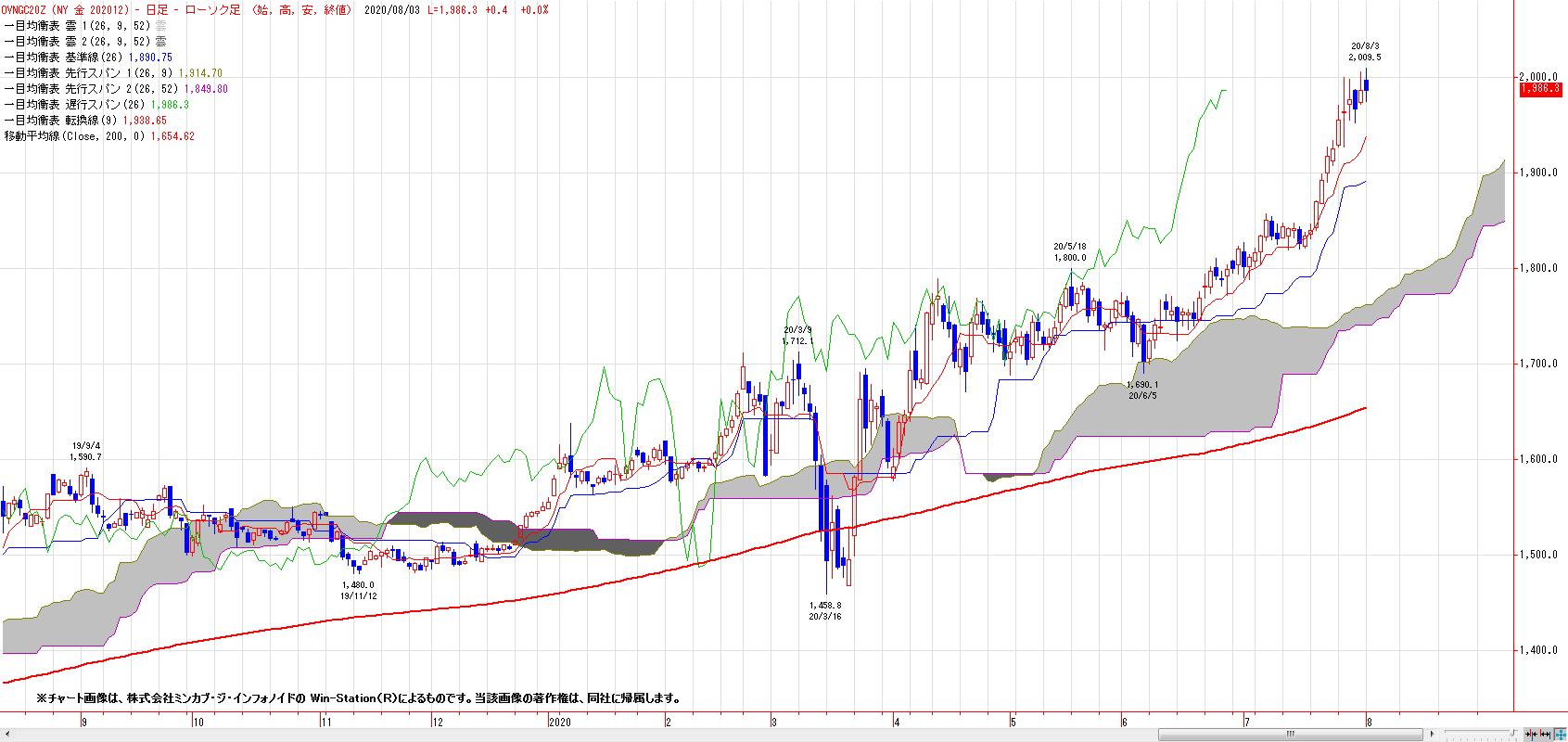 中国の7月の財新の中国製造業PMIが9年半ぶりの高水準となった事に続き、7月のドイツやユーロ圏の製造業PMIは上方修正され、ユーロ圏の製造業PMIは51.8まで回復。7月の米ISM製造業景況感指数も54.2と3ヶ月連続で上昇し、市場予想も上回ったこともあり、コロナ感染拡大懸念や、米中対立懸念もあるものの、NY金(12月限)は、2000ドルで上げ一服となっている。