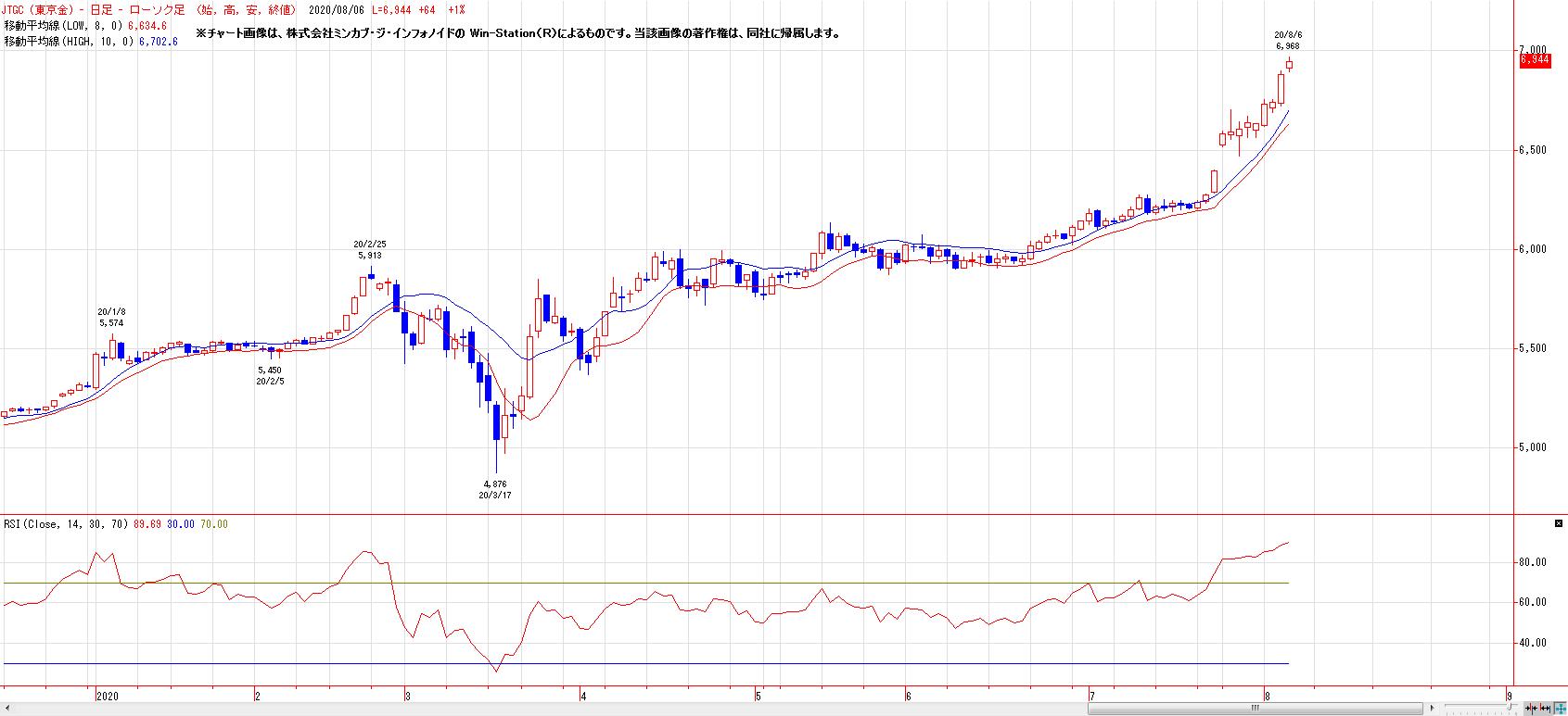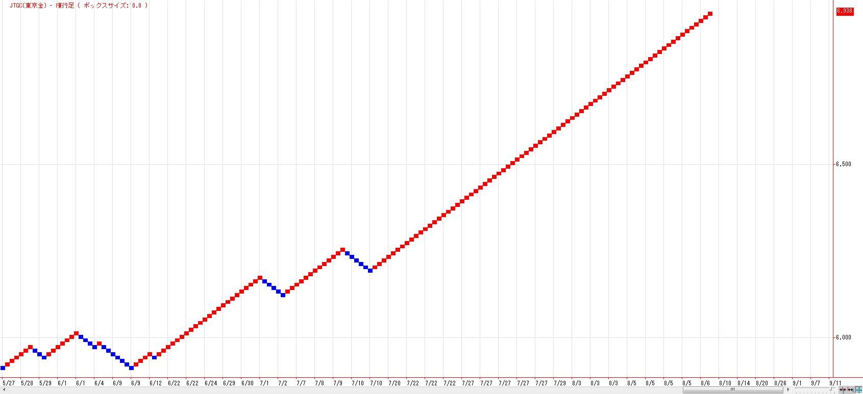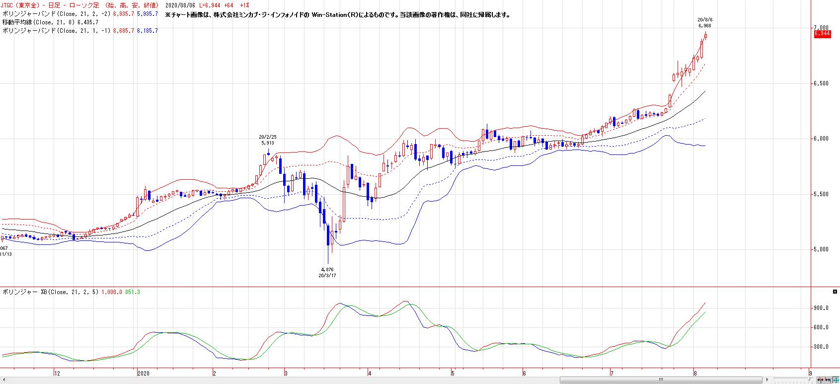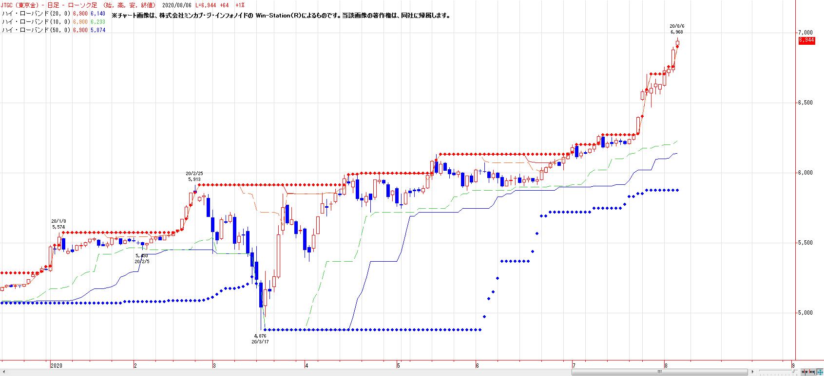 20日間・50日間高値を更新。多くのトレンドフォロー型指標が買い転換中。20日間安値(8/6時点:6140円)を下回らない限りは、陽転が継続。
