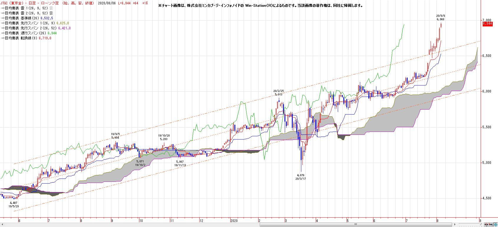 2019年5月安値を起点とした中期上昇チャネル継続。上げ過程で開けたGAP(6402円〜6518円)が下値支持帯。28日の上ヒゲ高値(6705円)と、29日の下ヒゲ安値(6470円)のレンジを、終値ベースで上放れて上げ加速。十二陽連で短期的な買われ過ぎ感もあるが、心理的節目7000円、N=7164円などを試す流れ継続。