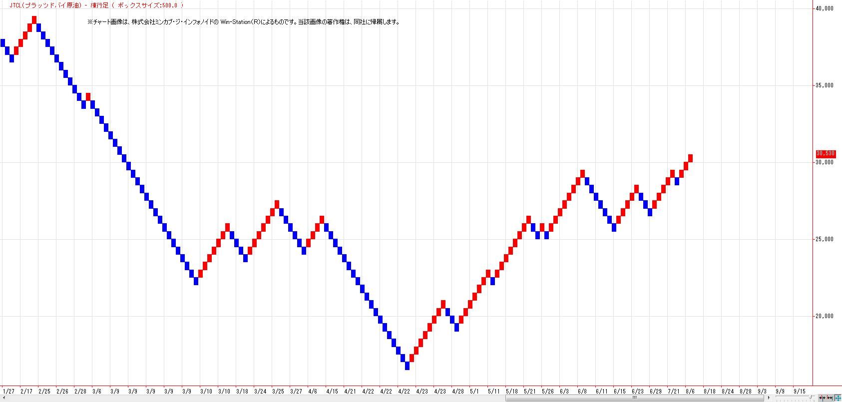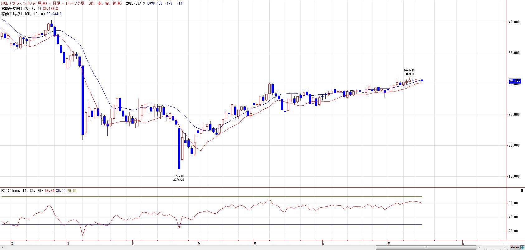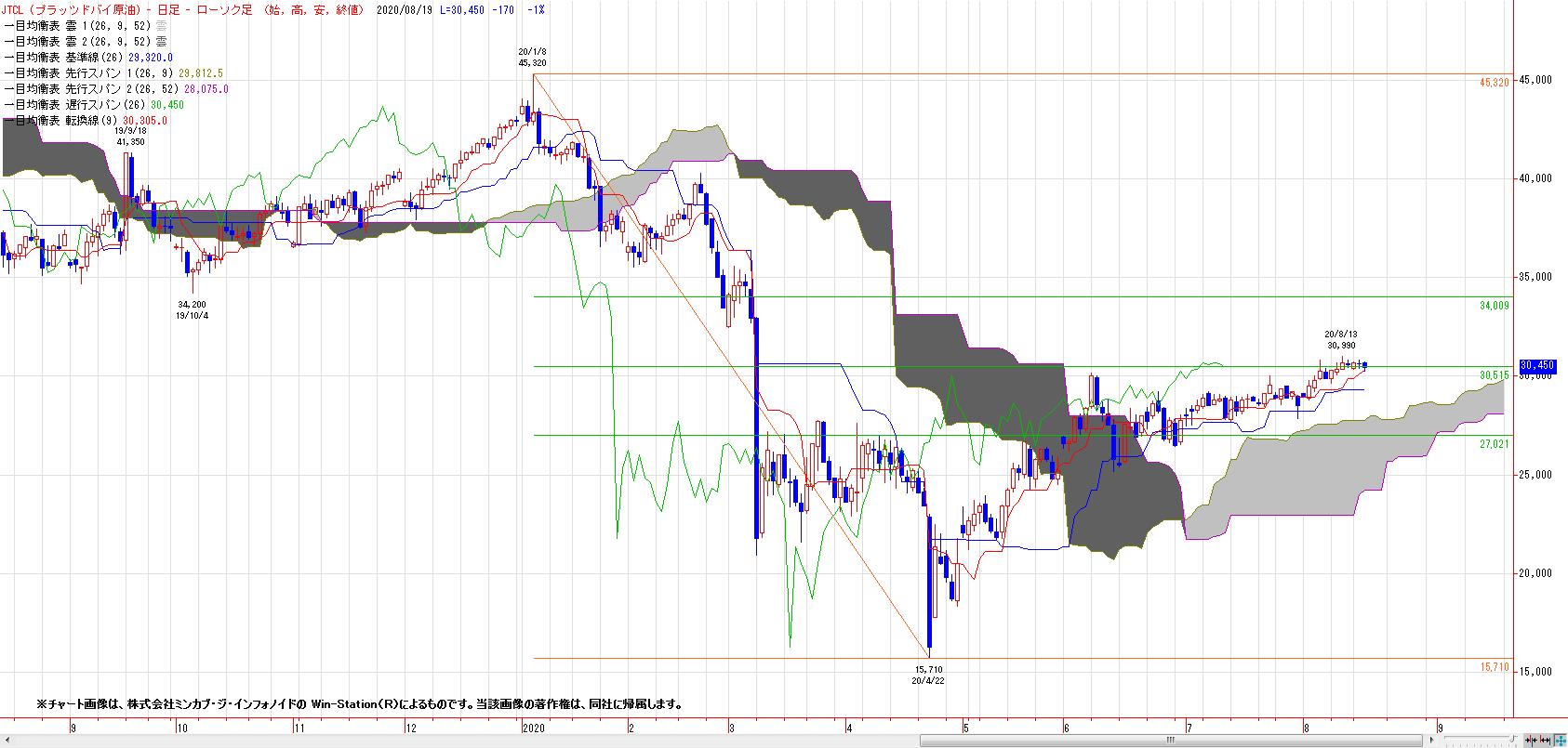 2020/08/19 東京原油(チャート分析) 本日の東京原油は続落。MACでは、8月6日にヒットした買いのトリガー継続。LMA(30160円)〜HMA(30630円)を下値支持帯とした押し目買い基調継続。ただし、LMA〜HMAのレンジは狭く、終値ベースで、LMAを割り込むと、売りのセットアップとなる。RSIは中段で横ばい推移。過熱感なし。 三角もち合い上放れも上げ加速には至らず。基準線〜転換線が下値支持帯。1月高値〜4月安値までの下げ幅に対する61.8%戻しは、34000円。 練行足は陽転継続。 「チャートワンポイント」カテゴリの最新記事 < 前の記事次の記事 >