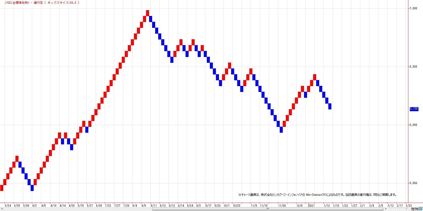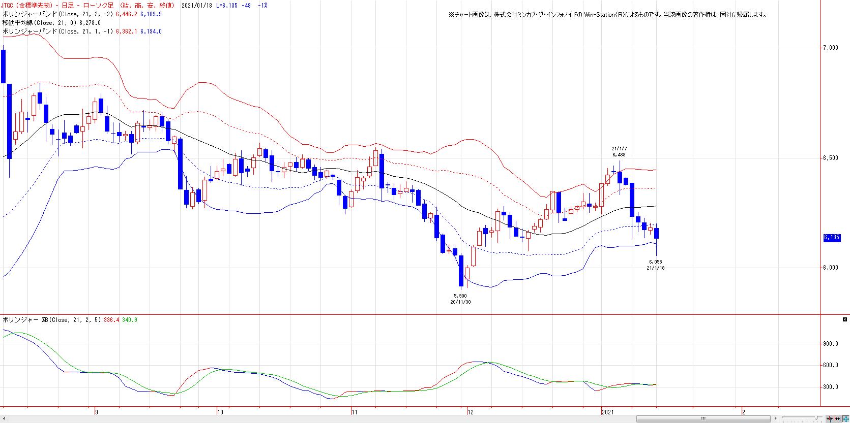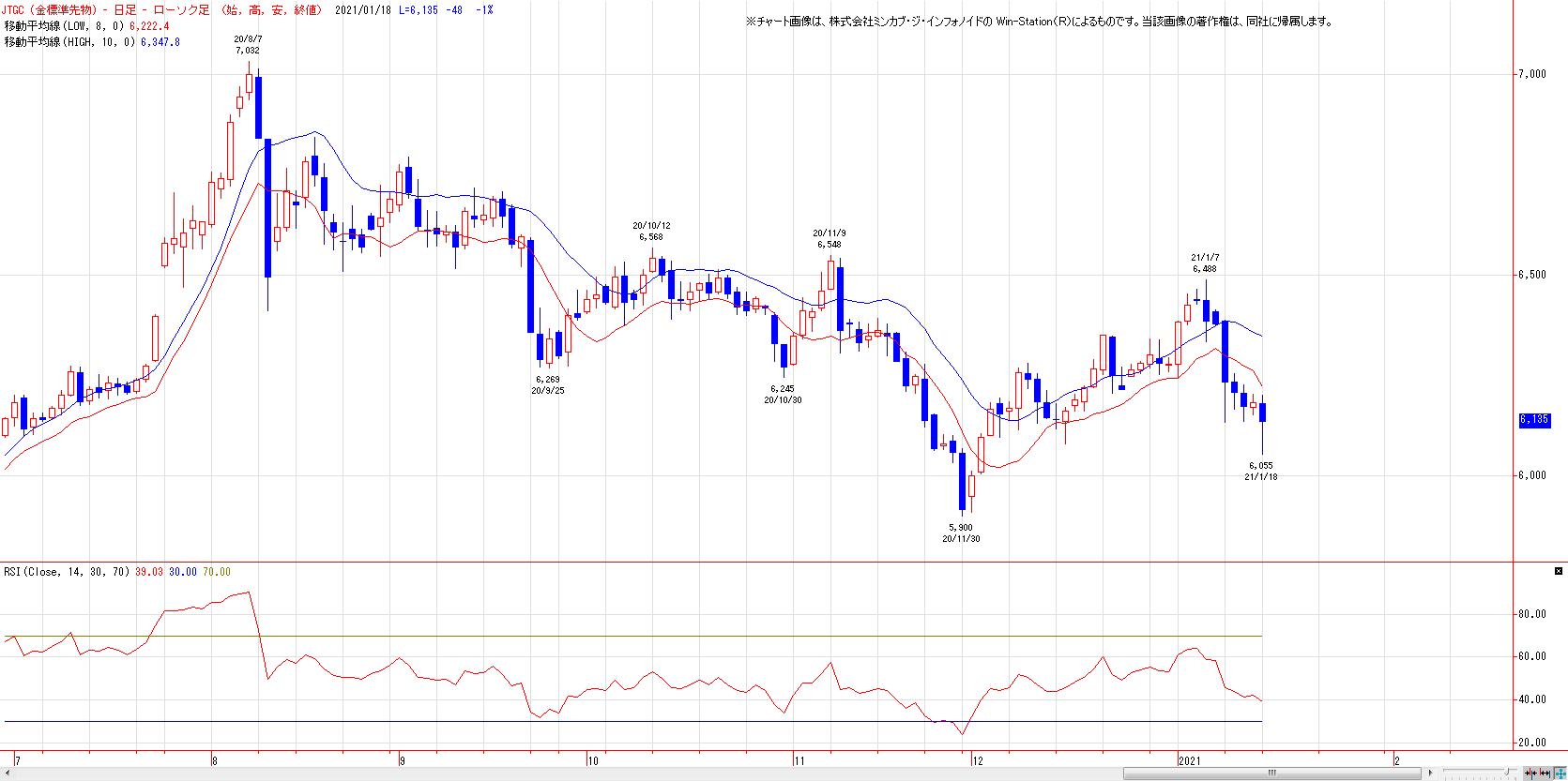 本日の金先限は反落。MACでは、13日にヒットした売りのトリガー継続。LMA(6222円)〜HMA(6347円)を上値抵抗帯とした戻り売り基調継続。