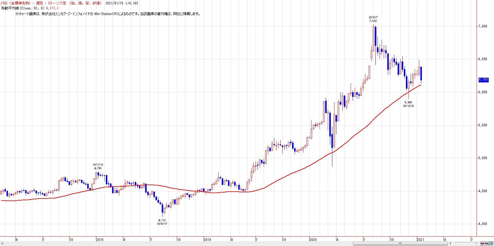 52週移動平均線は維持。2020年3月・11月に続き、52週移動平均線接近場面は、グランビルの買い法則。