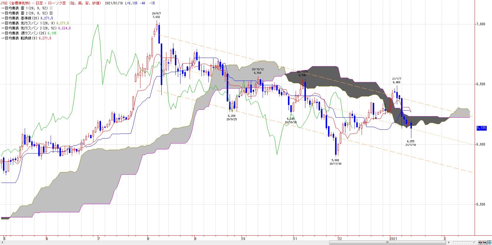 雲を割り込み、終値ベースで維持できず。ただし、押し目は買われて長い下ヒゲ形成。2020年11月安値〜2021年1月高値までの上昇に対する61.8%押し達成。