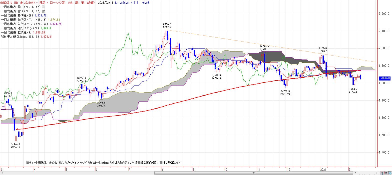 2021/02/12 NY金(チャート分析) NY金(4月限)は、雲のねじれの時間帯に200日移動平均線と重なる雲の抵抗に会い、反落。心理的節目1800ドル〜2月4日安値を維持できるか否かが焦点。同水準を維持して切り返しを見せることができれば、ダブルボトム移行へののシナリオは残る。 「チャートワンポイント」カテゴリの最新記事 < 前の記事次の記事 >