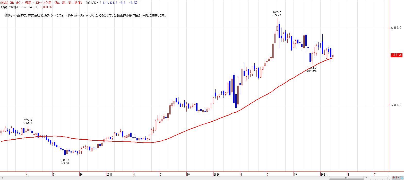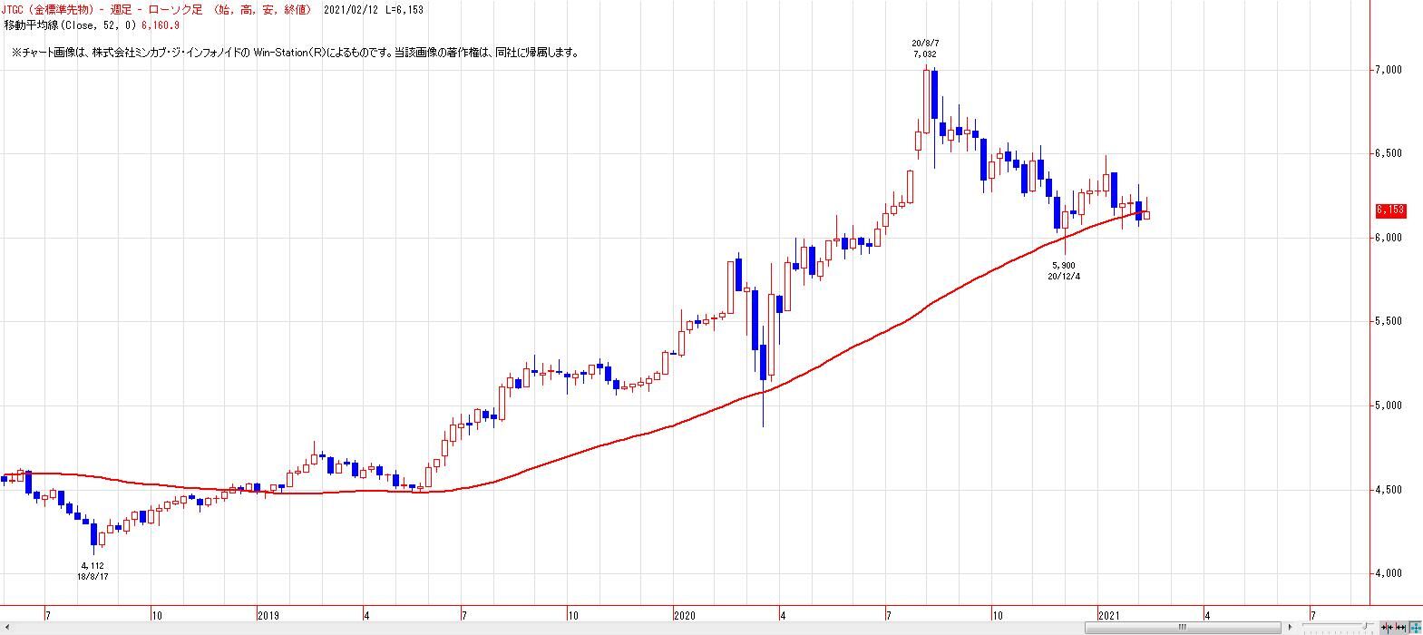 2021/02/15 金相場(52週移動平均線) OSE金先限は、52週移動平均線を維持できず。 ただし、NY金は、52週移動平均線を維持。 メイントレンドを決めるのは、マザーマーケットであるNY。 東京もNYに続いて52週移動平均線を回復してくると、底打ち感は高まる。引き続き、内外共に52週移動平均線の攻防が焦点。 「チャートワンポイント」カテゴリの最新記事 < 前の記事次の記事 >