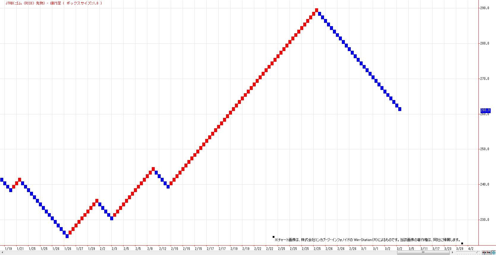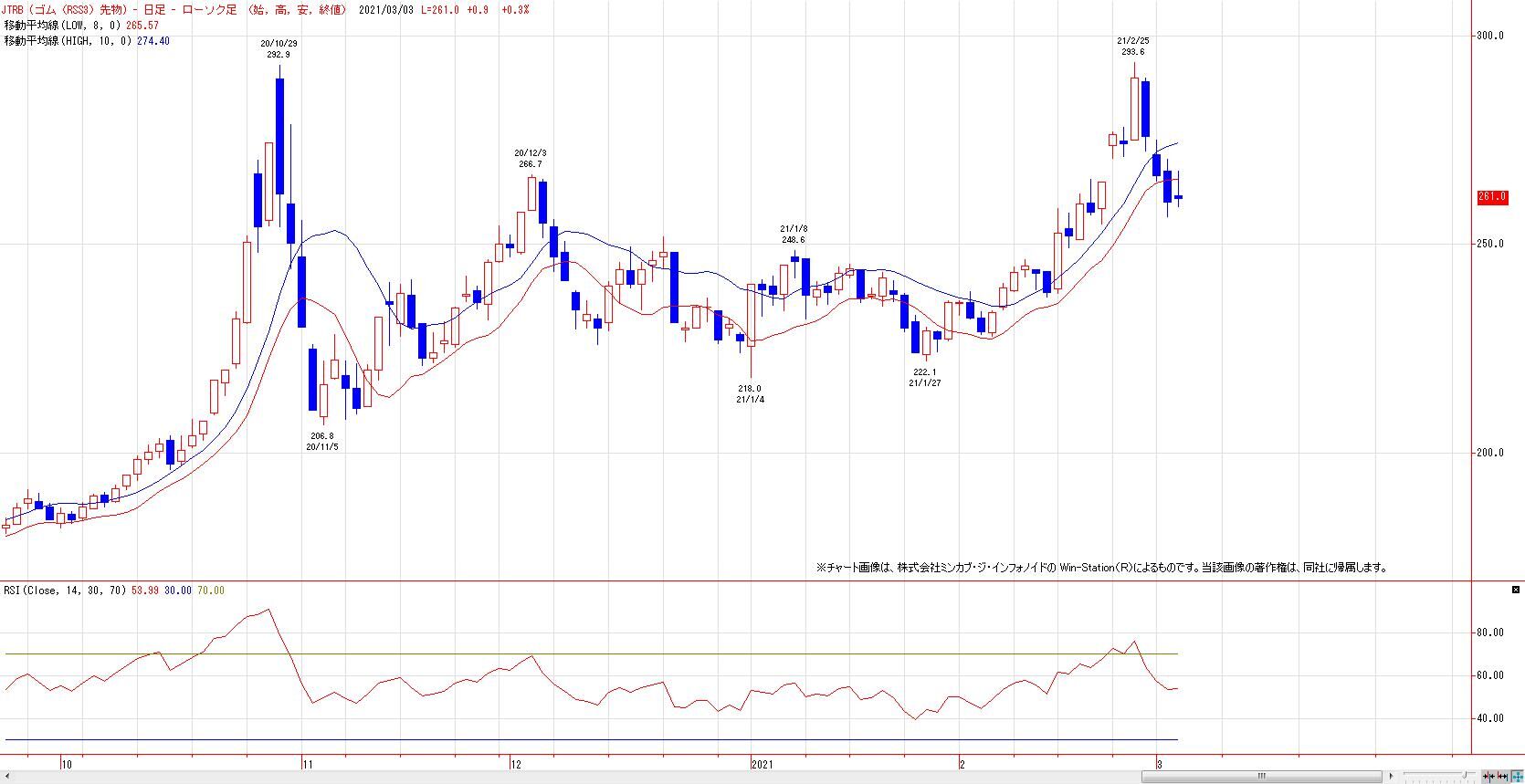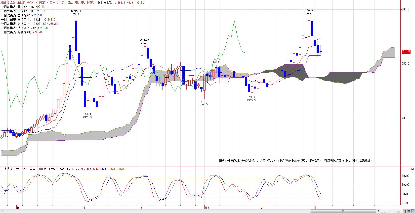 2021/03/03 記事タイトルゴムRSS3号先物(チャート分析) 本日のゴム先限(RSS3)は小反発も、上ヒゲの長い陰線引け。MACでは、売りのトリガーヒットとなった。LMA(265.5円)〜HMA(274.4円)を上値抵抗帯とした戻り売り基調入り。 1月安値〜2月高値までの上昇に対する半値押し達成。 61.8%押しは、249.4円。 雲のねじれでのトレンド変化(加速or転換)が注目。 練行足は陰転継続。 「チャートワンポイント」カテゴリの最新記事 < 前の記事次の記事 >