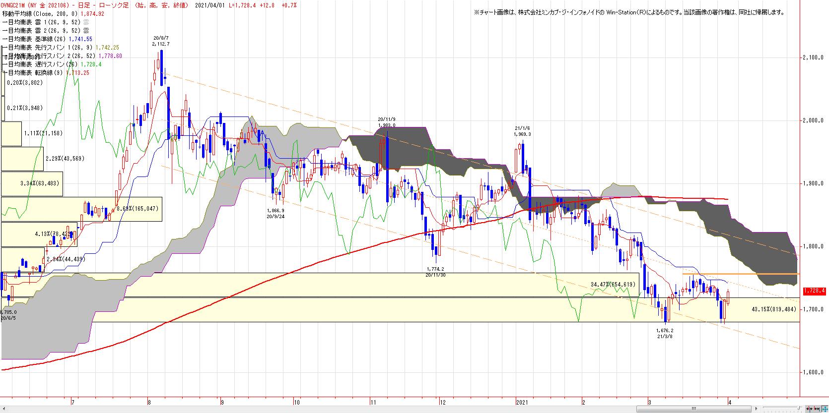2021/04/05 NY金&白金、ダブルボトム形成中 NY金(6月限)は、ダブルボトム形成中。価格帯別出来高の厚い1700ドル水準での底固め局面。 ネックライン(3/18高値:1756.1ドル)を上抜くと、ダブルボトム完成となる。N=1757.2ドル、V=1834.9ドル、E=1836ドルなどがカウント可能。 NY白金(7月)もダブルボトム形成中・雲の上限と重なるネックライン(3/16高値:1244ドル)を上抜くと、ダブルボトム完成となる。上値目標は、N=1277.3ドル、V=1339.5ドル、E=1372.8ドルなどがカウント可能。 「チャートワンポイント」カテゴリの最新記事 < 前の記事次の記事 >