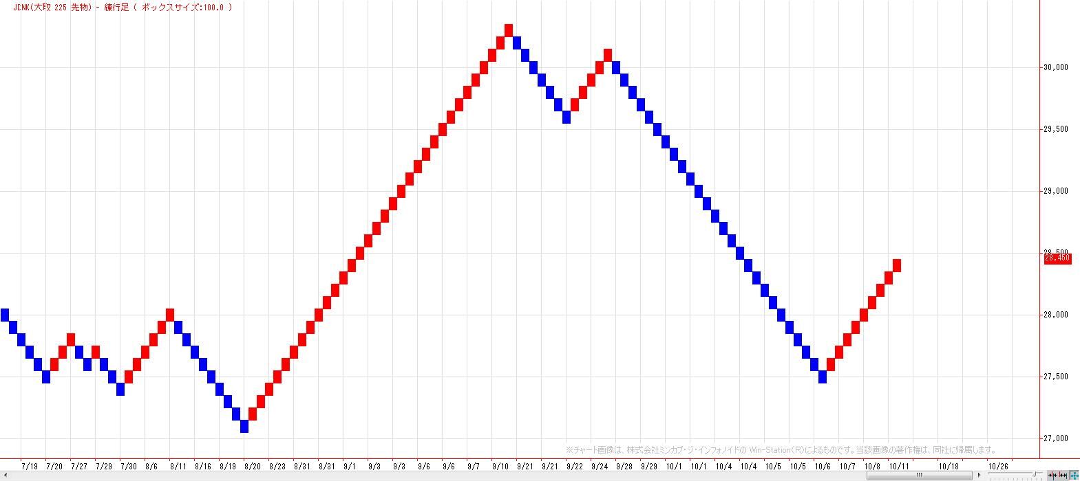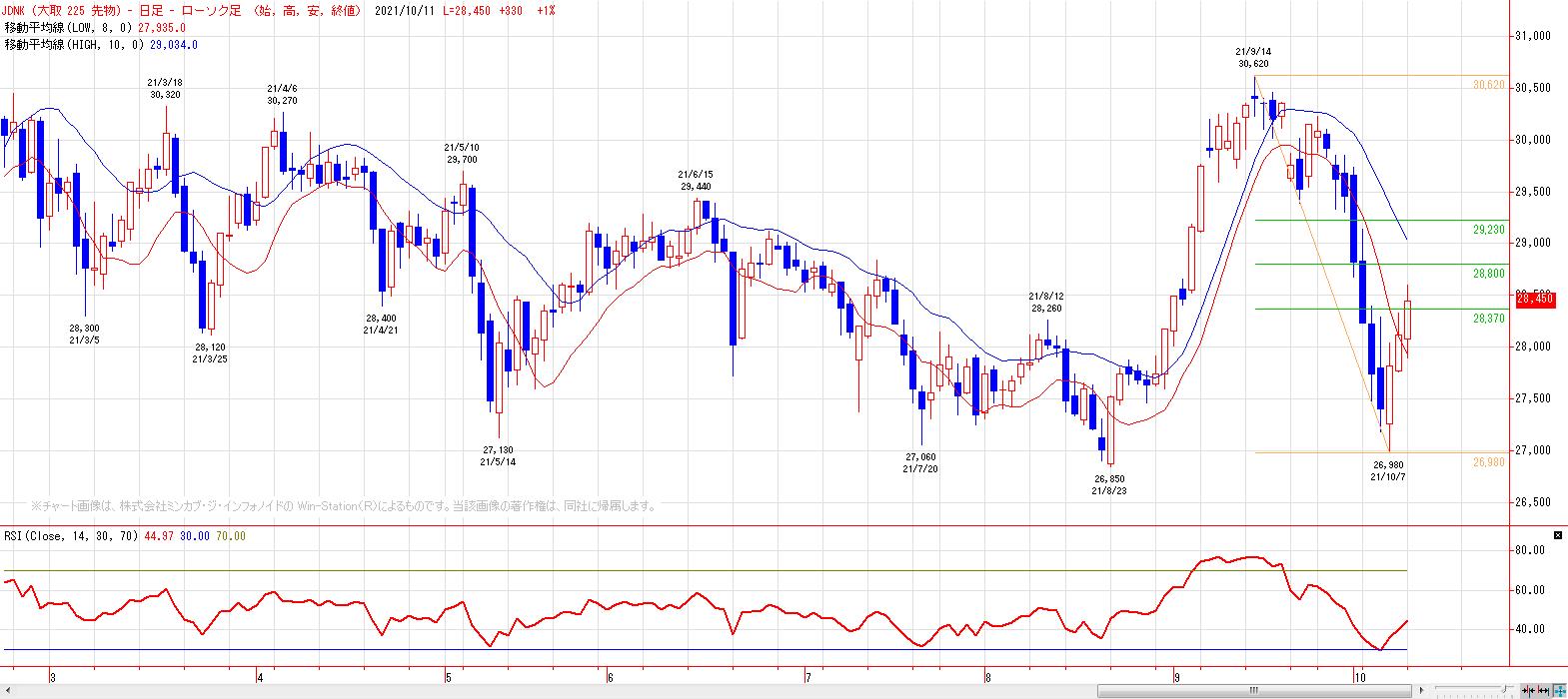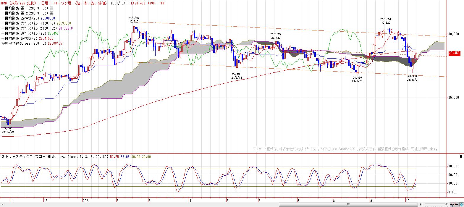 2021/10/11 日経225(チャート分析) 本日の日経225は、続伸。MACでは、9月22日にヒットした売りのトリガー継続。LMA(28110円)〜HMA(29190円)を上値抵抗帯とした戻り売り基調。 9月高値〜10月安値までの上昇に対する38.2%戻し達成。半値戻しは28800円。 ストキャスティクスはゴールデンクロスで自律反発局面。基準線〜200日移動平均線が上値抵抗帯。 トレンド変化が起こり易い雲のねじれの時間帯。雲の厚みも薄くなっていき、支持線としても抵抗線としても信頼性が落ちる時間帯へ向かう。 練行足は陽転継続。 「チャートワンポイント」カテゴリの最新記事 < 前の記事次の記事 >