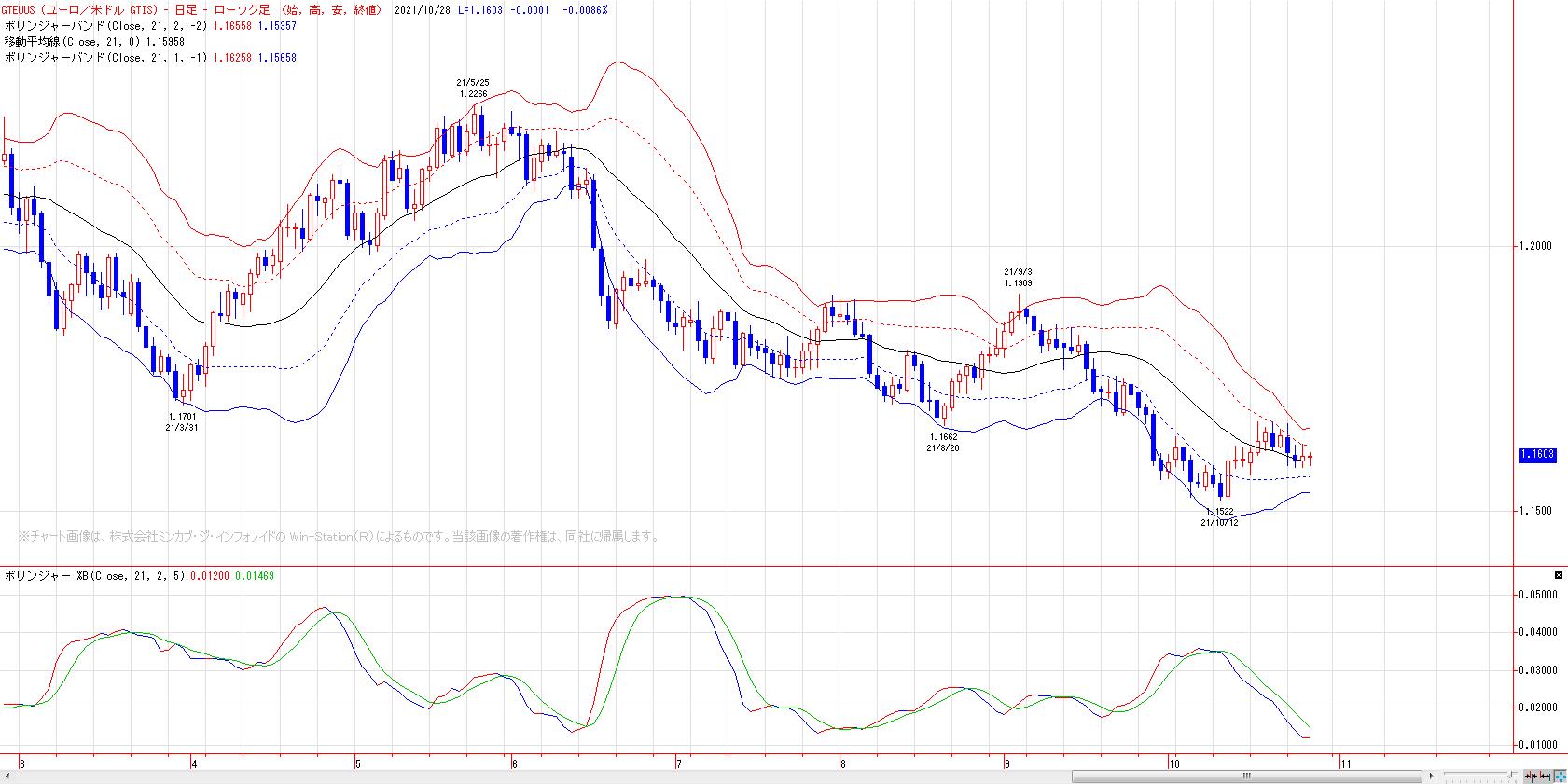 2021/10/28 ユーロドル(チャート分析) 金相場と相関の高いユーロドルだが、ボリンジャーバンドは収斂中で放れ待ち。ユーロの動意付いた方向に、NY金も追随する可能性。 「チャートワンポイント」カテゴリの最新記事 < 前の記事次の記事 >