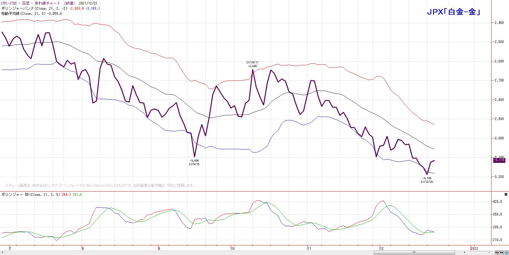 2021/12/22 JPX「白金ー金」 JPX「白金ー金」の鞘は、「金買い・白金売り」でのバンドウォーク継続中。-2σタッチで、一旦巻き戻しが入っているものの、鞘チャートが中心線を上抜いてこない限り、「金買い・白金売り」継続。 「チャートワンポイント」カテゴリの最新記事 < 前の記事次の記事 >