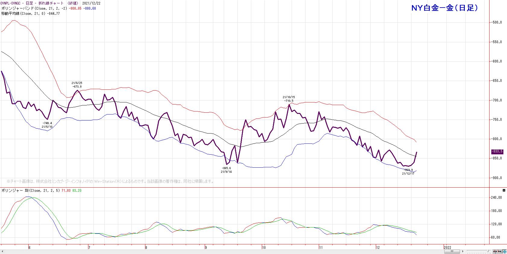 2021/12/23 NY「白金ー金」 NY「白金ー金」の鞘は、ボリンジャーバンドの中心線を上抜き、「白金買い・金売り」ポジションに。 「チャートワンポイント」カテゴリの最新記事 < 前の記事次の記事 >