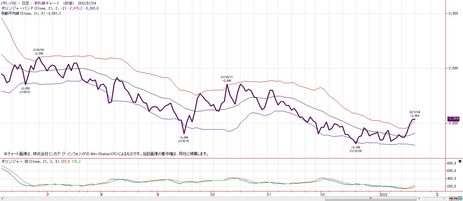 2022/01/24 JPX「白金-金」 JPX「白金-金」の鞘は、「金売り・白金買い」が継続だが、+2σを上方から下方へ突き抜けた際には、一部、ポジション調整(金買い・白金売り)の動きが想定される。 ただし、中心線を割り込まない限りは、「金買い・白金売り」へは途転しない。 「チャートワンポイント」カテゴリの最新記事 < 前の記事次の記事 >
