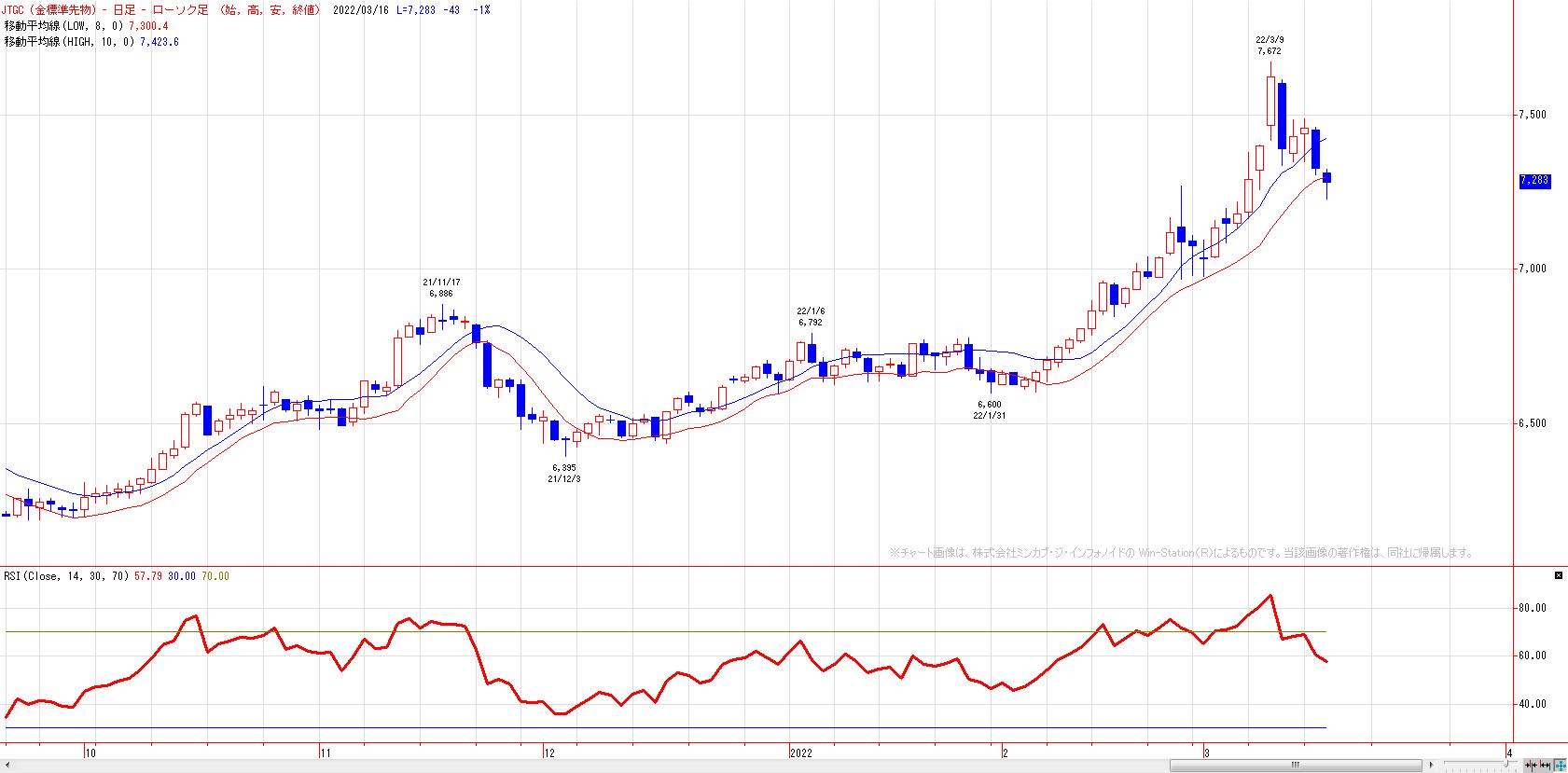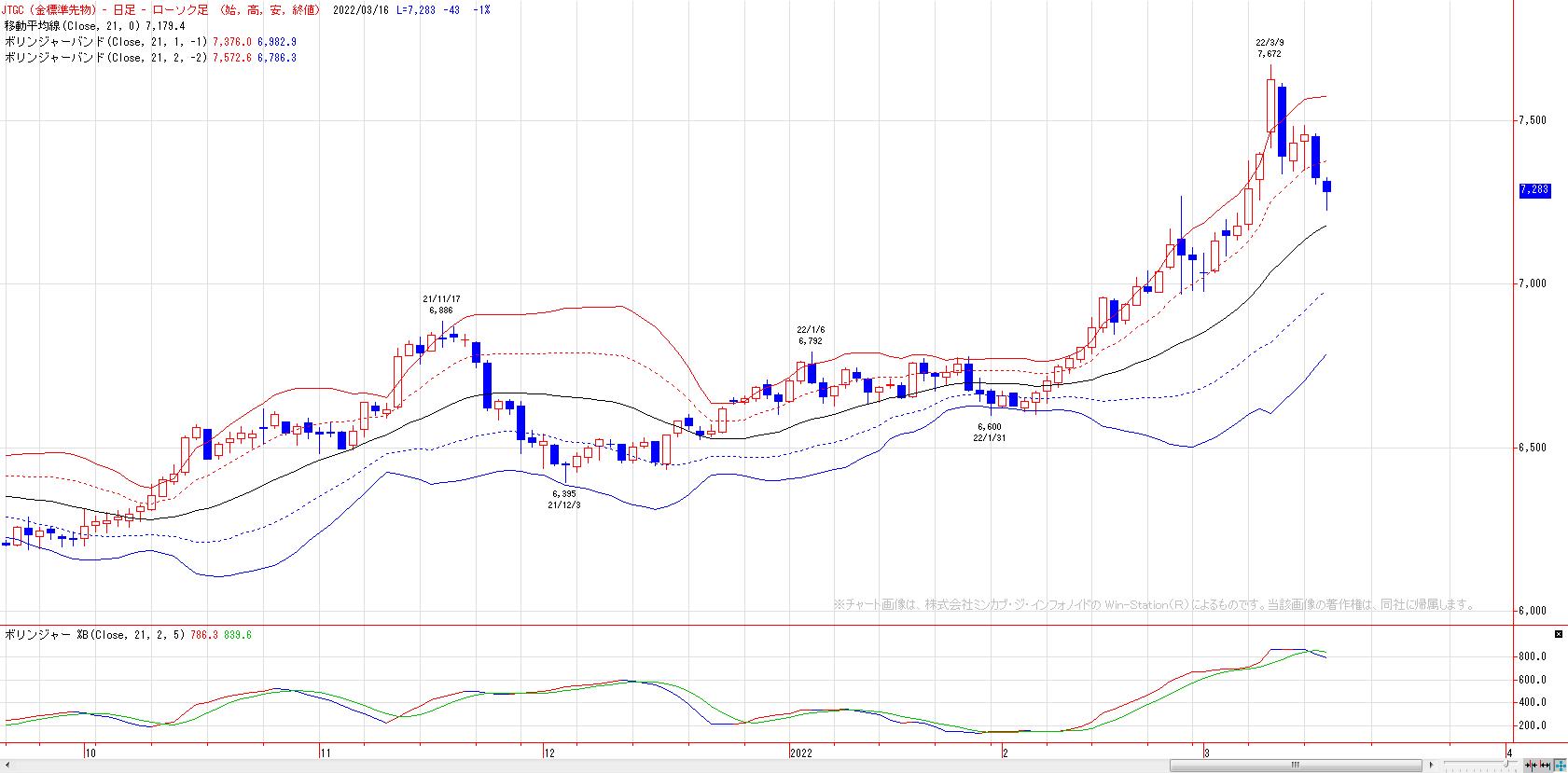本日の金先限は、続落。MACでは、売りのセットアップとなった。明日、終値ベースで、LMA(7300円)を割り込むと、売りのトリガーヒットとなる。