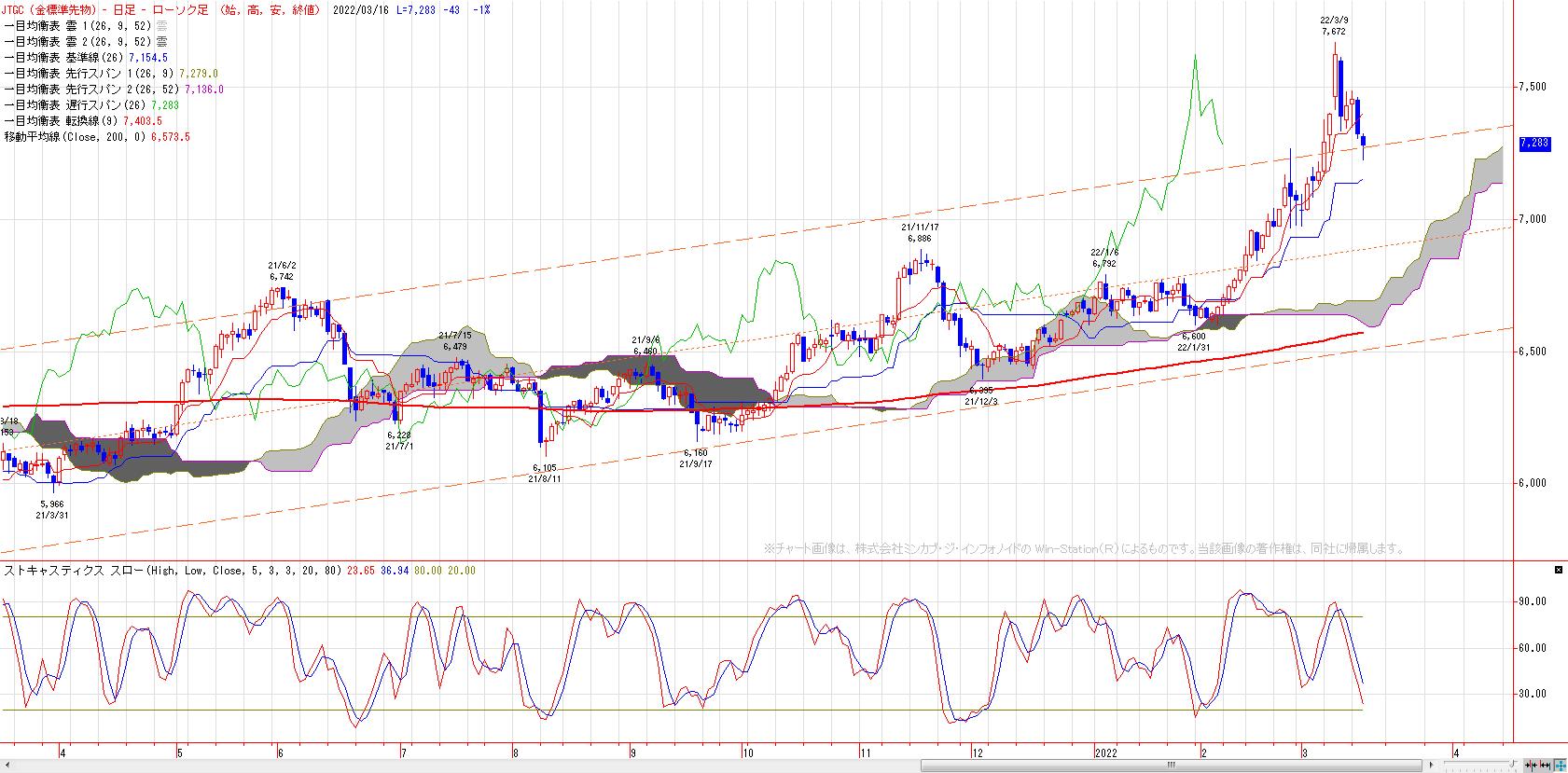 3月安値を起点とした上昇チャネル継続。心理的節目7700円が上値抵抗。転換線割れで基準線が意識される。1月31日安値〜3月高値までの上昇に対する38.2%押しは7262円、半値押しは、基準線と重なる7136円。