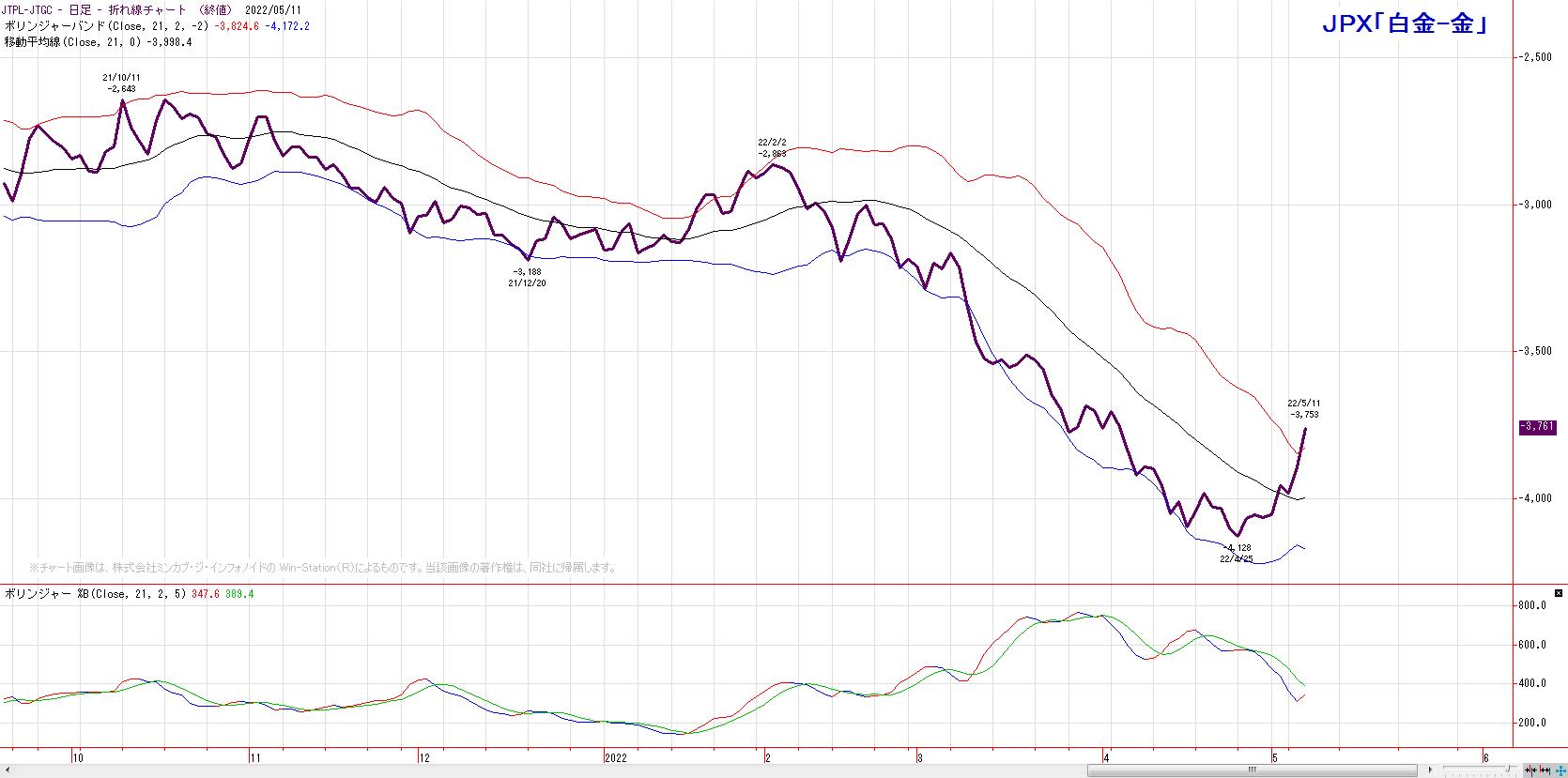 2022/05/11 「白金−金」の鞘(チャート分析) 「白金−金」の鞘は、「金売り・白金買い」。+2σ突破しているものの、中心線を維持する限りは、鞘の状態は変わらない。 「チャートワンポイント」カテゴリの最新記事 < 前の記事次の記事 >