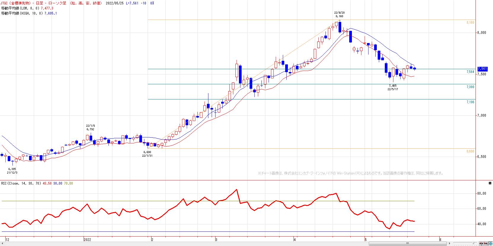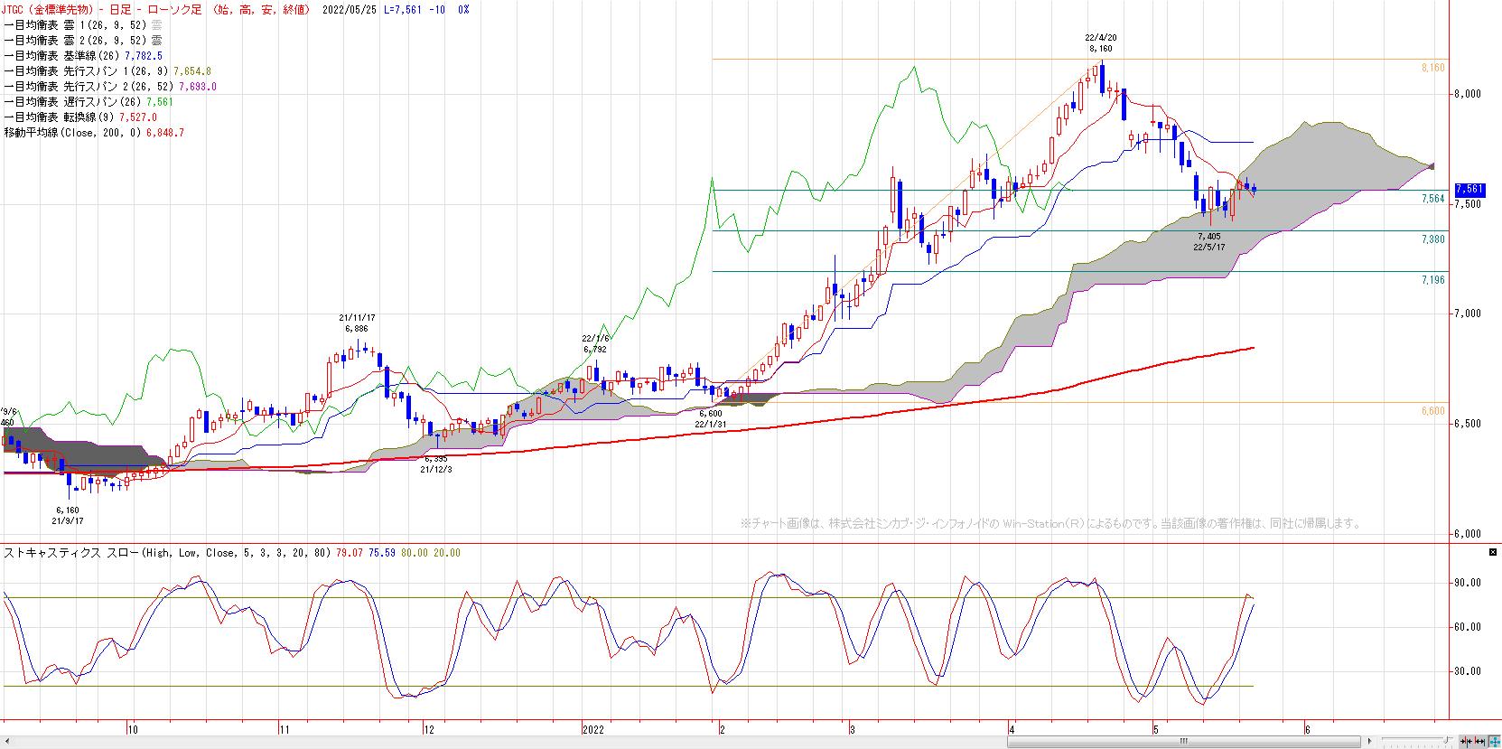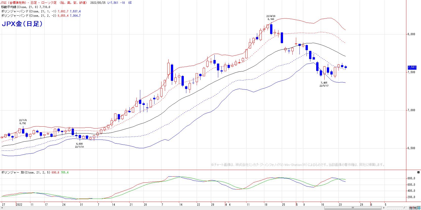 2022/05/25 JPX金(チャート分析) 本日のJPX金先限は、反落。MACでは、4月26日にヒットした売りのトリガー継続。LMA(7477円)〜HMA(7605円)が上値抵抗帯。1月安値〜4月高値までの上昇に対する半値押し(7380円)〜61.8%押し(7196円)が下値支持帯。 逆転した基準線〜転換線が上値抵抗帯。ネックライン(5/18高値)を超えてくると、ダブルボトムが意識される。V=7796円、E=7817円。 練行足は陽転継続。 ボリンジャーバンドは、中心線への戻りを試す流れ。 「チャートワンポイント」カテゴリの最新記事 < 前の記事次の記事 >
