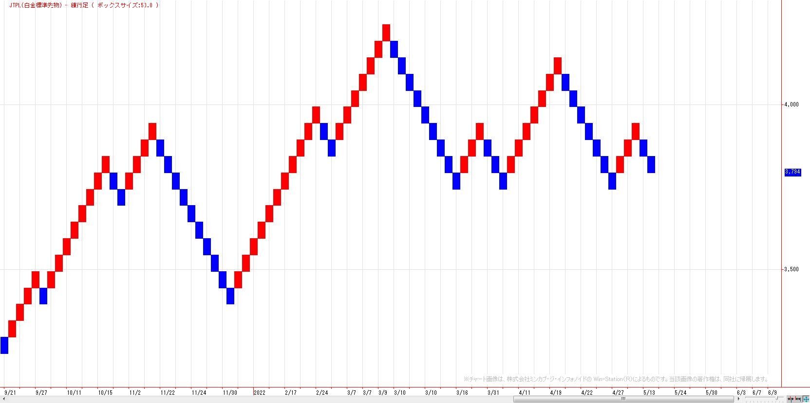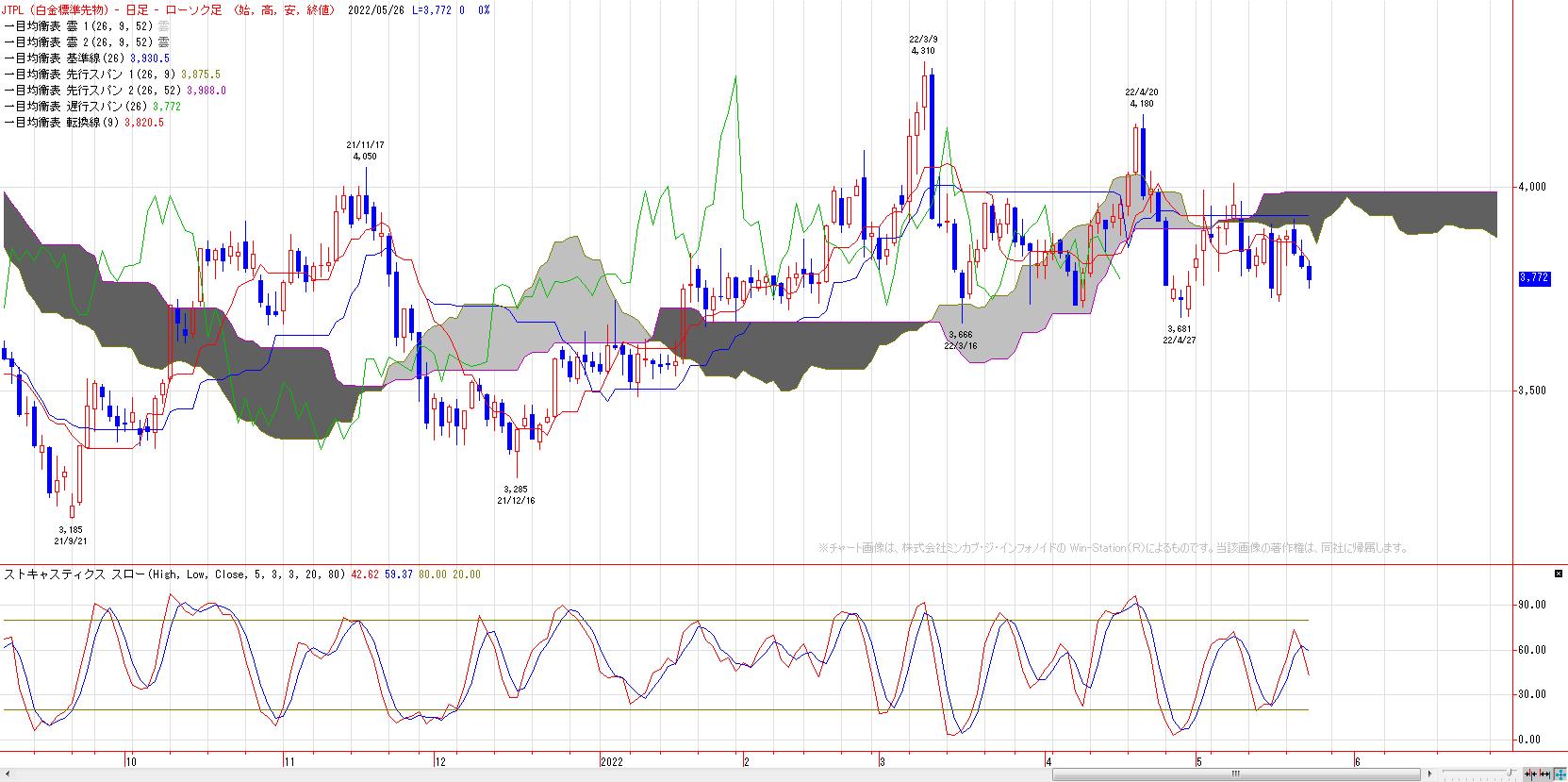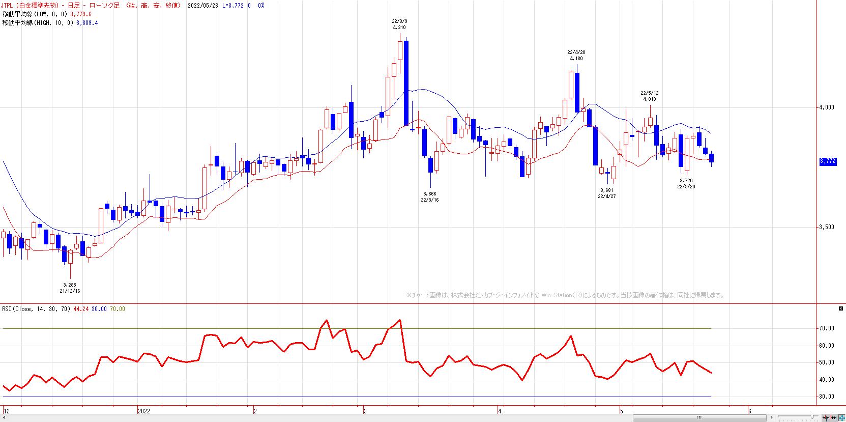 2022/05/26 JPX白金(チャート分析) 本日のJPX白金は、続落。MACでは、売りのセットアップとなった。明日、終値ベースで、LMA(3778円)を割り込むと、売りのトリガーヒットとなる。 心理的節目4000円と重なる5/12高値(4010円)が上値抵抗。4月27日安値(3681円)が下値支持。 練行足は 陰転継続。 「チャートワンポイント」カテゴリの最新記事 < 前の記事次の記事 >