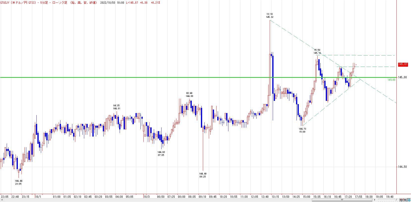 2022/10/03 ダブルボトム完成(ドル円5分足) ドル円5分足は、三角保合い上放れ後、ダブルボトム完成。 15:50の高値を上抜くと、一段の踏み上げへ。 「チャートワンポイント」カテゴリの最新記事 < 前の記事次の記事 >