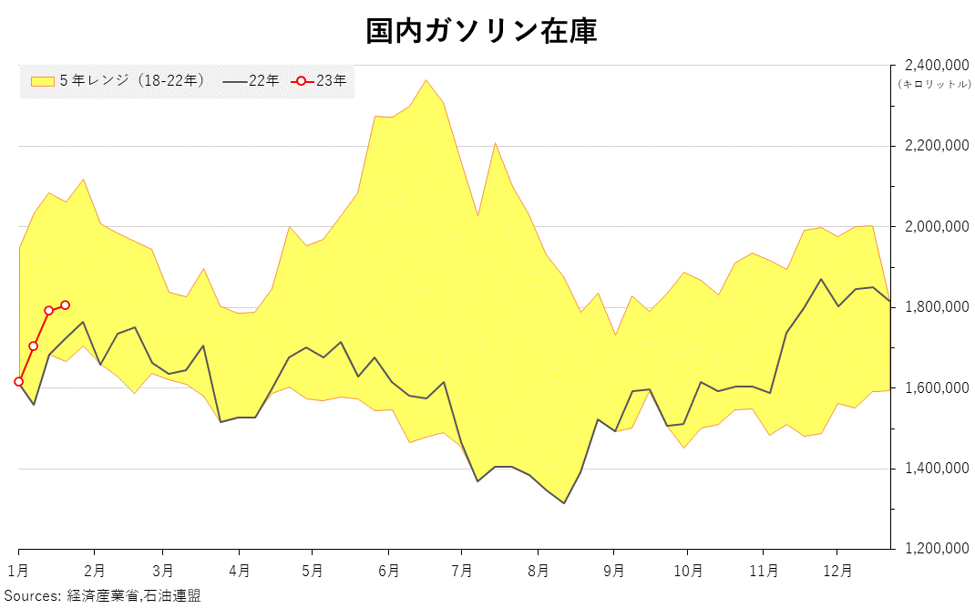 2023/01/25 石連週報(15〜21日) 石油連盟が25日発表した原油・石油製品供給統計週報(15〜21日)によると ガソリンの週末在庫は、前週比0.8%増の180万6169キロリットル 灯油在庫は2.4%減の212万8434キロリットル 軽油在庫は7.5%減の153万3771キロリットル。 週間原油処理量は1.8%減の322万0829キロリットル。 推定を基に出荷した推定出荷量は ガソリンが4.7%減の72万3332キロリットル 灯油は9.0%増の47万8273キロリットル 軽油は25.5%増の67万4609キロリットル 「旗は鳴る鳴る ラッパは響く」カテゴリの最新記事 < 前の記事次の記事 >
