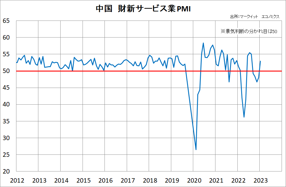 2023/02/03 財新/中国サービス部門PMI 財新/S&Pグローバルが3日発表した1月の中国サービス部門購買担当者景気指数(PMI)は52.9と、前月の48.0から上昇し、景況改善・悪化の分かれ目となる50を5カ月ぶりに上回った。 新型コロナウイルス感染を抑え込むゼロコロナ政策の緩和で消費と旅行が押し上げられ、信頼感指数は2011年2月以来の高水準を付けた。 中国国家統計局が今週発表した1月の非製造業PMIも54.4と前月の41.6から上昇していた。 「旗は鳴る鳴る ラッパは響く」カテゴリの最新記事 < 前の記事次の記事 >