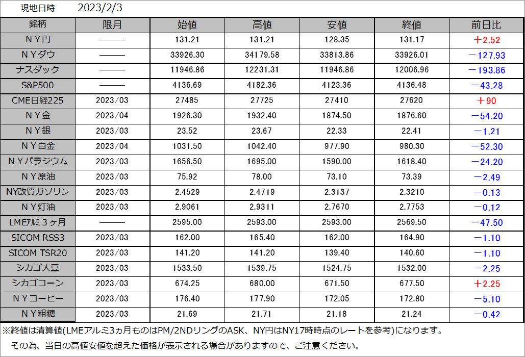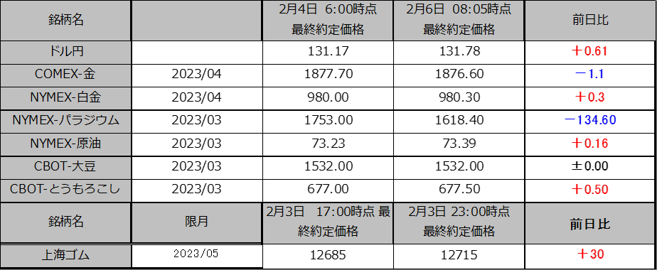 2023/02/06 寄付き予想 本日の国内市場は、 貴金属市場は、金が-32円前後、白金が-83円前後、 原油市場は、-380円前後、 ゴム(RSS)市場は、+1.2円前後、 穀物市場は、コーンが+770円前後で始まる見通し。 「旗は鳴る鳴る ラッパは響く」カテゴリの最新記事 < 前の記事次の記事 >