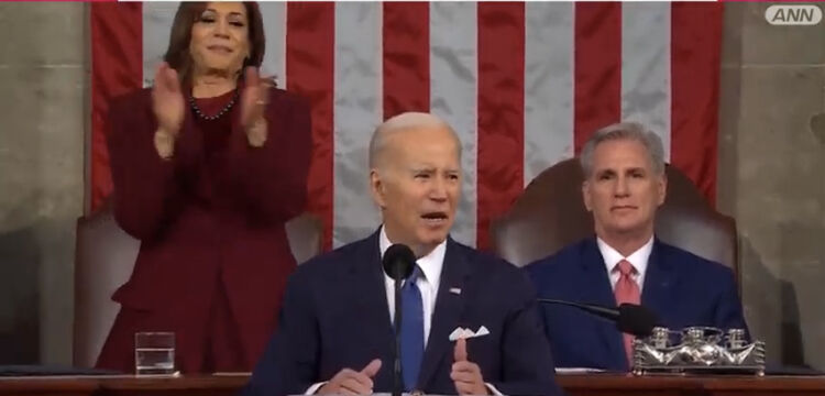 バイデン大統領の後ろに控えるハリス副大統領が笑顔で拍手に対して、マッカーシー下院議長は、苦虫をつぶしたまま。