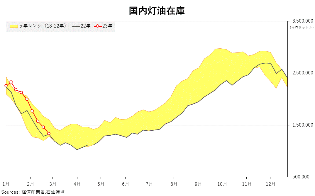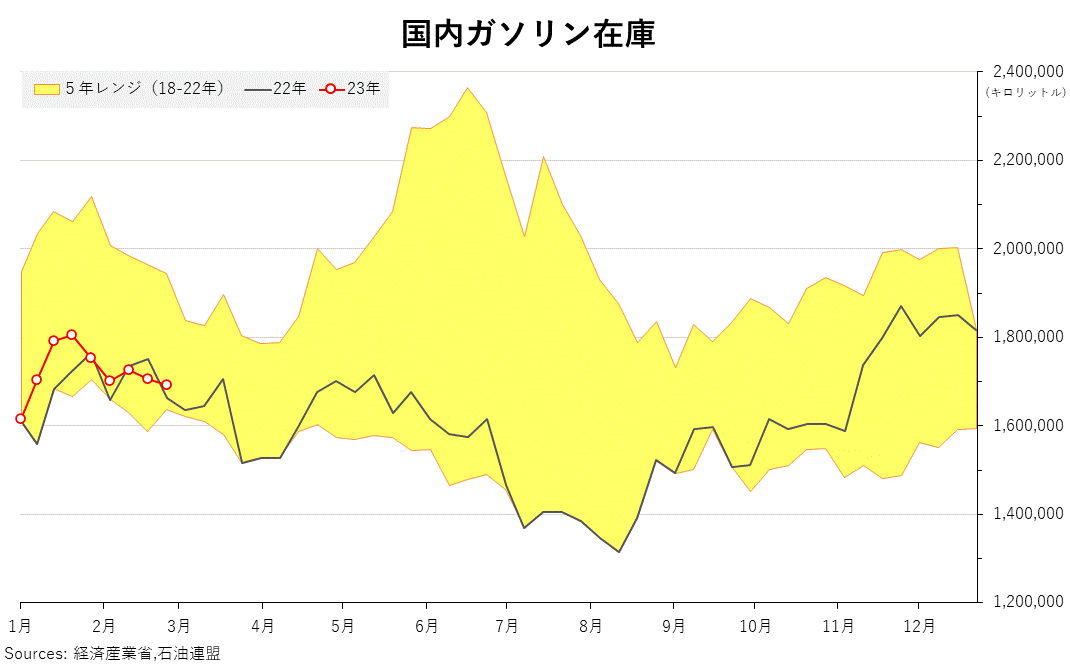 2023/03/01 石連週報(2月19日〜2月25日) ガソリンの週末在庫は、前週比0.8%減の169万1644キロリットル。 灯油在庫は8.4%減の133万8612キロリットル。 週間原油処理量は1.2%増の309万5606キロリットル。 推定出荷量は、 ガソリンが10.4%増の84万2099キロリットル。 灯油が10.6%増の41万1467キロリットル。 「旗は鳴る鳴る ラッパは響く」カテゴリの最新記事 < 前の記事次の記事 >