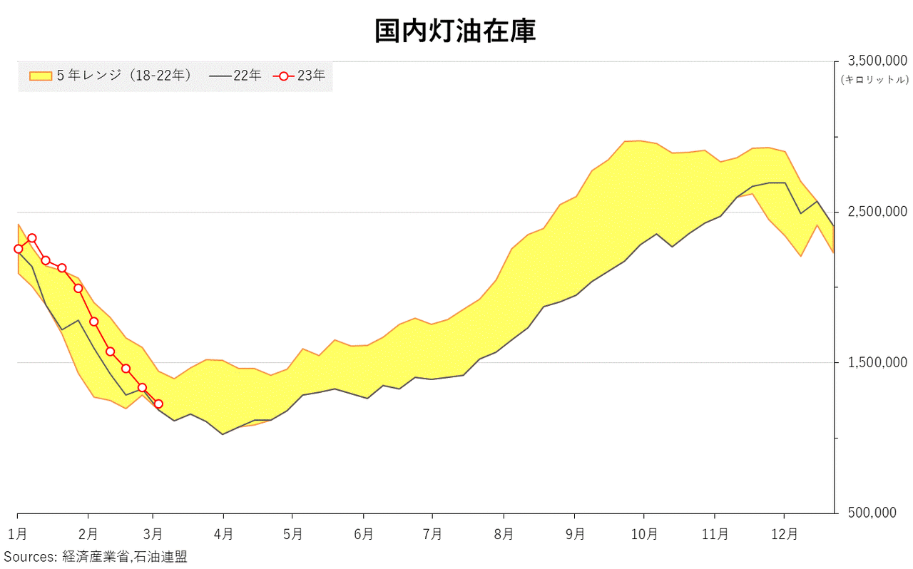 2023/03/08 石連週報(2月26日〜3月4日) 石油連盟が8日発表した原油・石油製品供給統計週報(2月26日〜3月4日)によると ガソリンの週末在庫は、前週比2.6%減の164万7104キロリットル 灯油在庫は8.3%減の122万7394キロリットル 軽油在庫は4.4%減の118万5232キロリットル 週間原油処理量は5.4%減の292万6932キロリットル。 統計を基に算出した推定出荷量は ガソリンが0.7%減の83万6239キロリットル 灯油が2.3%減の40万2192キロリットル 軽油は1.8%減の65万1051キロリットル 「旗は鳴る鳴る ラッパは響く」カテゴリの最新記事 < 前の記事次の記事 >
