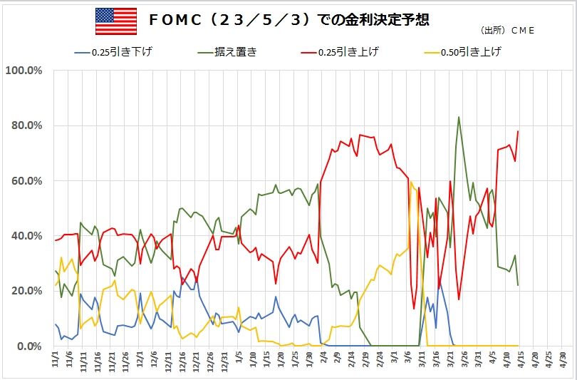 これを受けて、米金利先物市場で5月の25ベーシスポイント(bp)の追加利上げ観測が高まっている。
