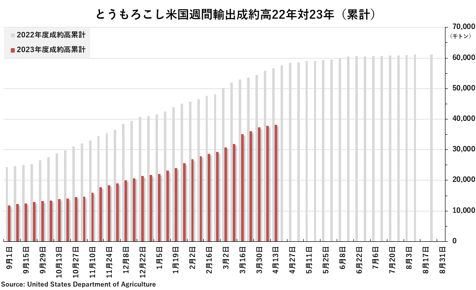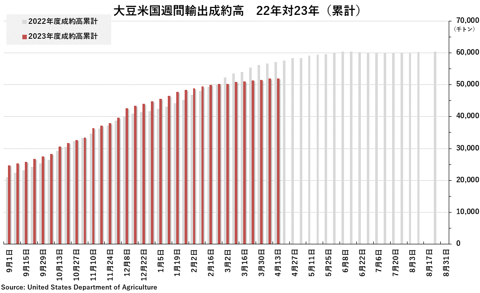 2023/04/21 週間純輸出成約高(4月13日までの週) 大豆:10万3000トン(事前予想レンジ:50万〜95万トン) 大豆粕:14万4500トン(事前予想レンジ:13万〜32万トン) 大豆油:200トン(事前予想レンジ: 0〜5000トン) コーン:73万4400トン(事前予想レンジ:60万〜85万トン) 小麦:30万5100トン(事前予想レンジ:20万〜48万トン) 「旗は鳴る鳴る ラッパは響く」カテゴリの最新記事 < 前の記事次の記事 >
