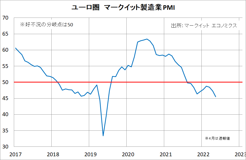 一方、製造業は需要が一段と落ち込み、PMIは47.3から45.5に低下。新型コロナウイルスのパンデミック開始以来、最低となった。