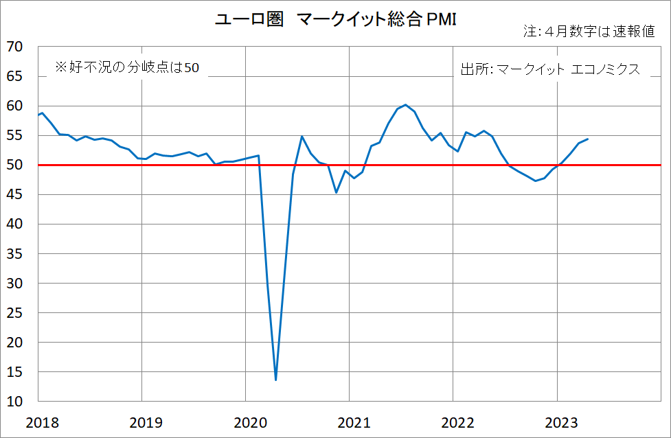 S&Pグローバルが21日発表した4月のユーロ圏のHCOB総合購買担当者景気指数(PMI)速報値は54.4で、3月の53.7から上昇し11カ月ぶりの高水準となった。事前予想中央値の53.7を上回った。