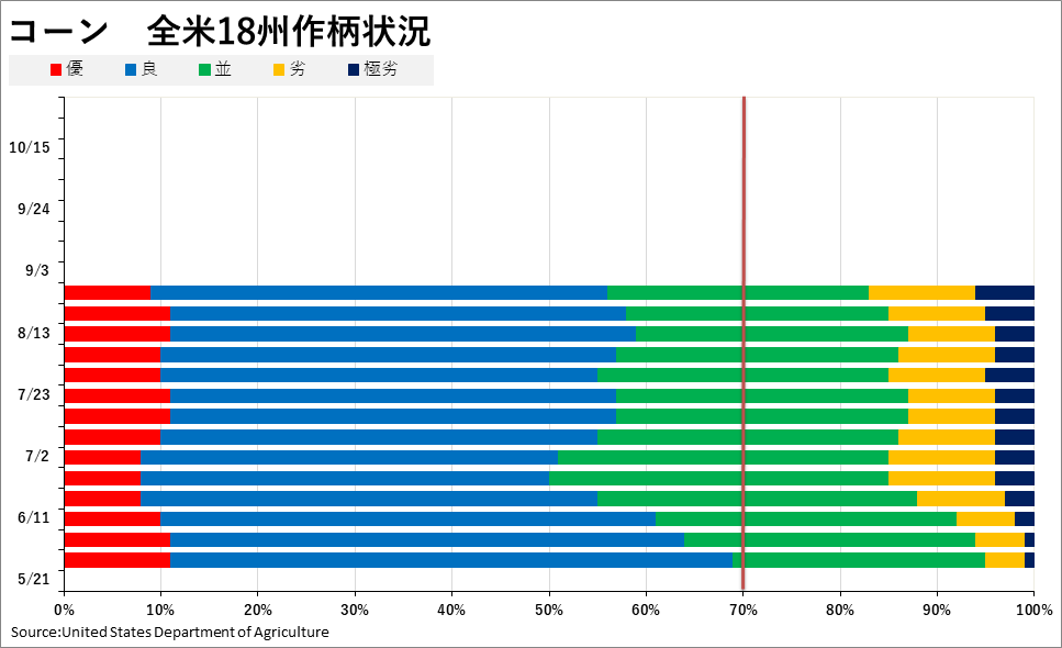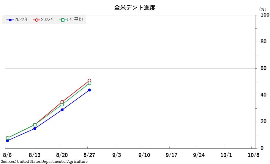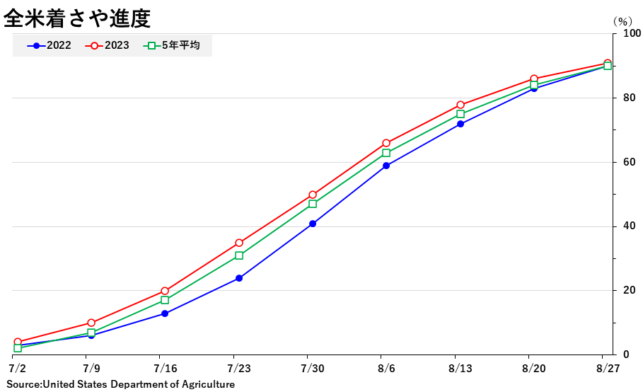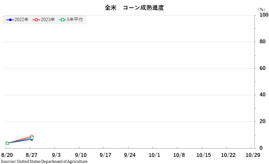 2023/08/29 週間作物進度報告(8月27日までの週) 大豆: 着サヤ:91% (前週 86%、前年90%、平年90%) 落葉:5%(前週 −、 前年 4%、平年 6%) 「良」以上:58% (前週 59%、前年57%) 「劣」以下:14% (前週 13%、前年13%) コーン: ドウ:88%(前週78%、前年84%、平年86%) デント:51%(前週35%、前年44%、平年49%) 成熟:9%(前週 4%、前年 7%、平年 8%) 「良」以上:56% (前週58%、前年54%) 「劣」以下:17% (前週15%、前年19%) 「旗は鳴る鳴る ラッパは響く」カテゴリの最新記事 < 前の記事次の記事 >