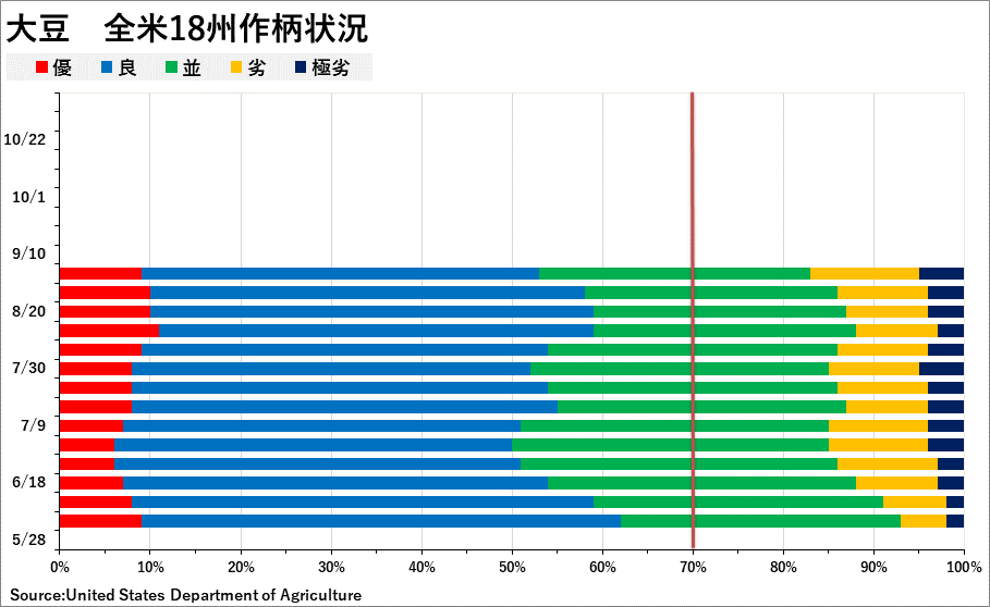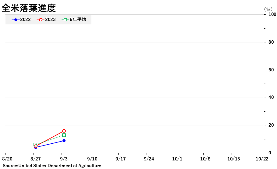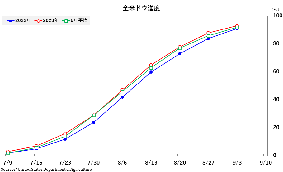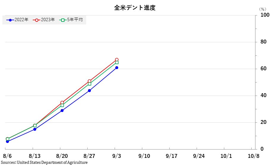 2023/09/06 週間作物進度報告(9月3日までの週) 大豆: 着サヤ:95% (前週 91%、前年94%、平年94%) 落葉:16%(前週 5%、 前年 9%、平年13%) 「良」以上:53% (前週 58%、前年57%) 「劣」以下:17% (前週 14%、前年14%) コーン: ドウ:93%(前週88%、前年91%、平年92%) デント:67%(前週51%、前年61%、平年65%) 成熟:18%(前週 9%、前年14%、平年16%) 「良」以上:53% (前週56%、前年54%) 「劣」以下:18% (前週17%、前年19%) 「旗は鳴る鳴る ラッパは響く」カテゴリの最新記事 < 前の記事次の記事 >