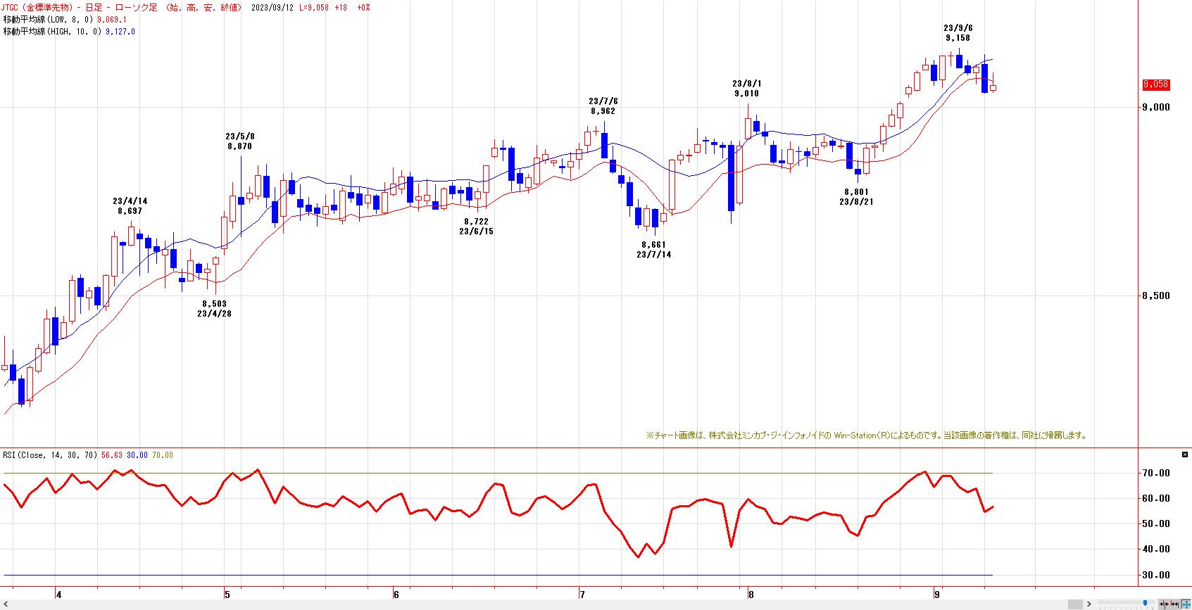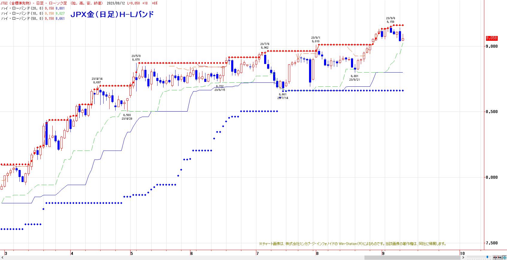 本日のJPX金先限は、反発。MACでは、売りのトリガーヒットとなった。LMA(9069円)〜HMA(9127円)を上値抵抗帯とした戻り売り基調入り。