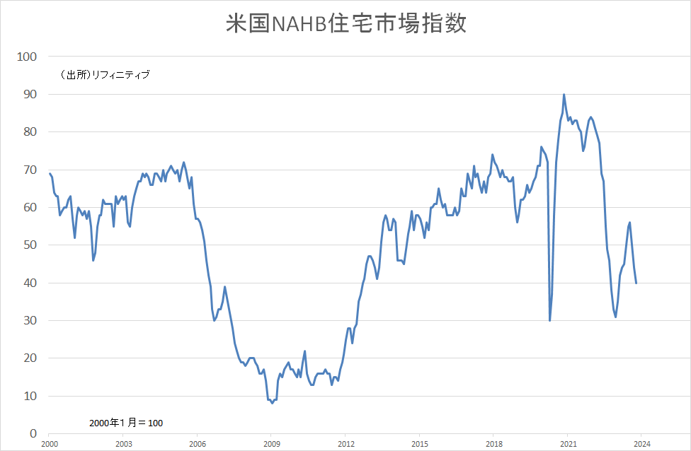 2023/10/18 NAHB/ウエルズ・ファーゴ住宅建設業者指数 全米住宅建設業者協会(NAHB)が17日発表した10月のNAHB/ウエルズ・ファーゴ住宅建設業者指数は40と、3カ月連続で低下し、1月以来の低水準となった。高水準の住宅ローン金利が住宅建設業者の心理を圧迫した。 市場予想は44。9月改定値も44だった。 「旗は鳴る鳴る ラッパは響く」カテゴリの最新記事 < 前の記事次の記事 >