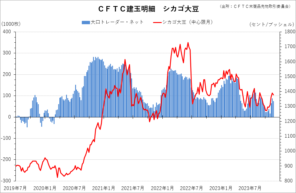 2023/11/28 CFTC建玉明細(穀物) CFTC建玉明細(11/21現在)によると大豆の大口投機玉は、73,806枚の買い越し。前週(86,677枚の買い越し)から縮小。 コーンは、124,006枚の売り越し。前週(109,200枚の売り越し)から拡大。 「CFTC建玉明細」カテゴリの最新記事 < 前の記事次の記事 >