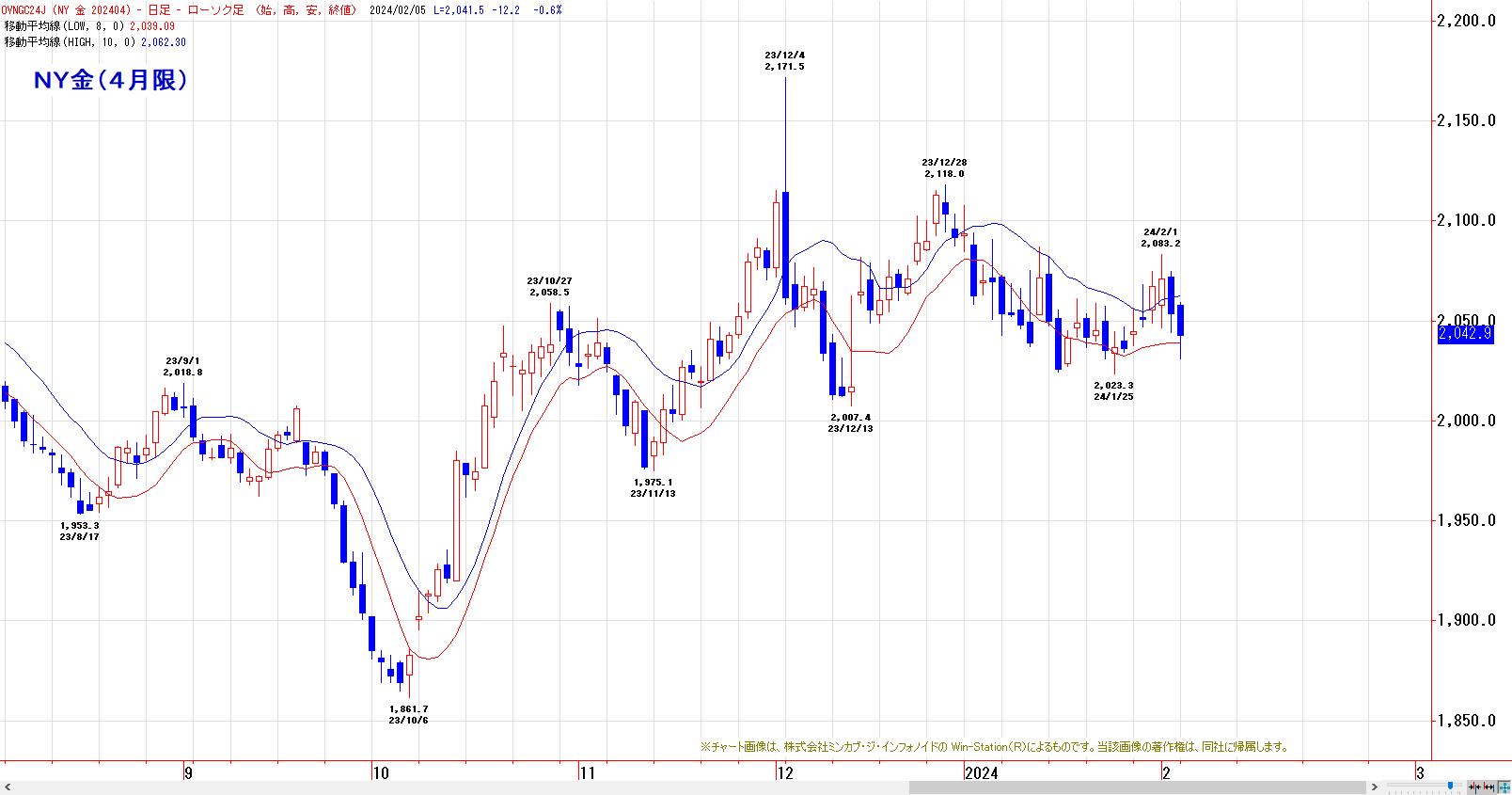 NY金(4月限)は、続落。MACでは、2月1日にヒットした買いのトリガー継続。本日はザラ場でLMAを割り込んだが終値ベースでは下ヒゲで値を戻したが、今晩以降、終値ベースで、LMA(2039ドル)を割り込むと、売りのセットアップとなる。