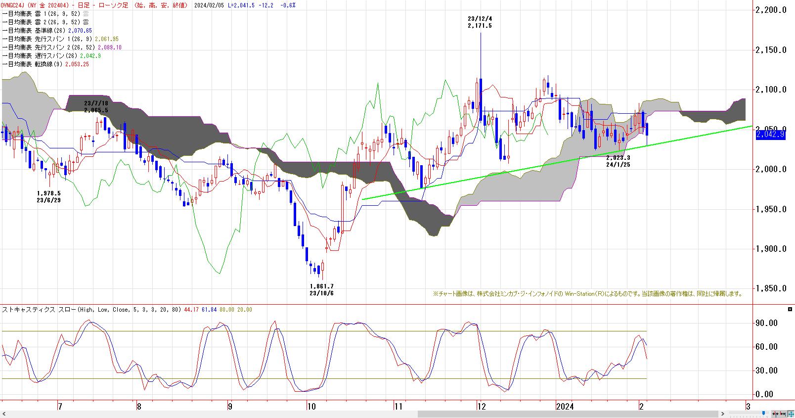 一目均衡表では雲の下限を割り込んでおり、ネックライン(緑線)を割り込むと、三尊天井完成が意識される。その場合の下値目標は、N=1988.5ドル、V=1963.4ドル、E=1928.6ドルなどがカウント可能。