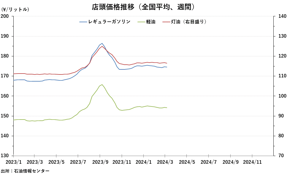 2024/03/06 石油製品価格調査 資源エネルギー庁が6日発表した石油製品価格調査によると、4日現在のレギュラーガソリン1リットル当たりの小売価格(全国平均)は、前週比0.2円安の174.5円。8週間ぶりの値下がり。 灯油の全国小売価格は4日現在1リットル当たり、前週比0.3円安の116.6円。3週間ぶりの値下がり。 「旗は鳴る鳴る ラッパは響く」カテゴリの最新記事 < 前の記事次の記事 >