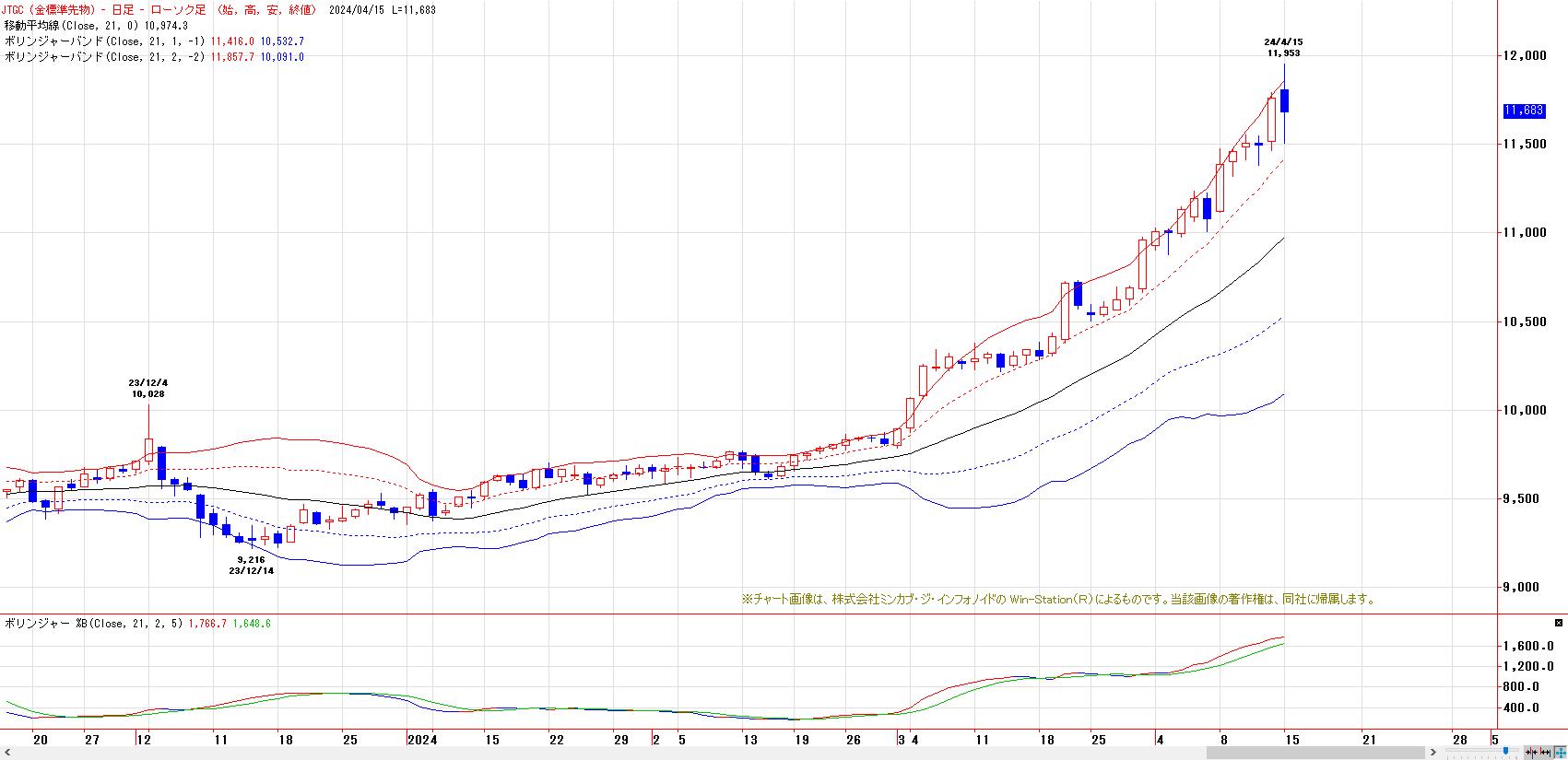20日間・50日間高値更新で、多くのトレンドフォロー系指標は陽転のまま。ボリンジャーバンドは、順張り型のバンドウォーク形成中。+1σを維持できるか否かが焦点。