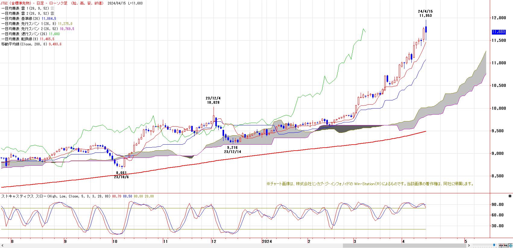 ストキャスティクスは、ダブルトップを形成して、デッドクロス。短期的な買われ過ぎ感に対する調整が予感される。心理的節目11500円と重なる転換線を維持できるか否かが焦点。維持できれば、値幅調整ではなく日柄調整の可能性も。