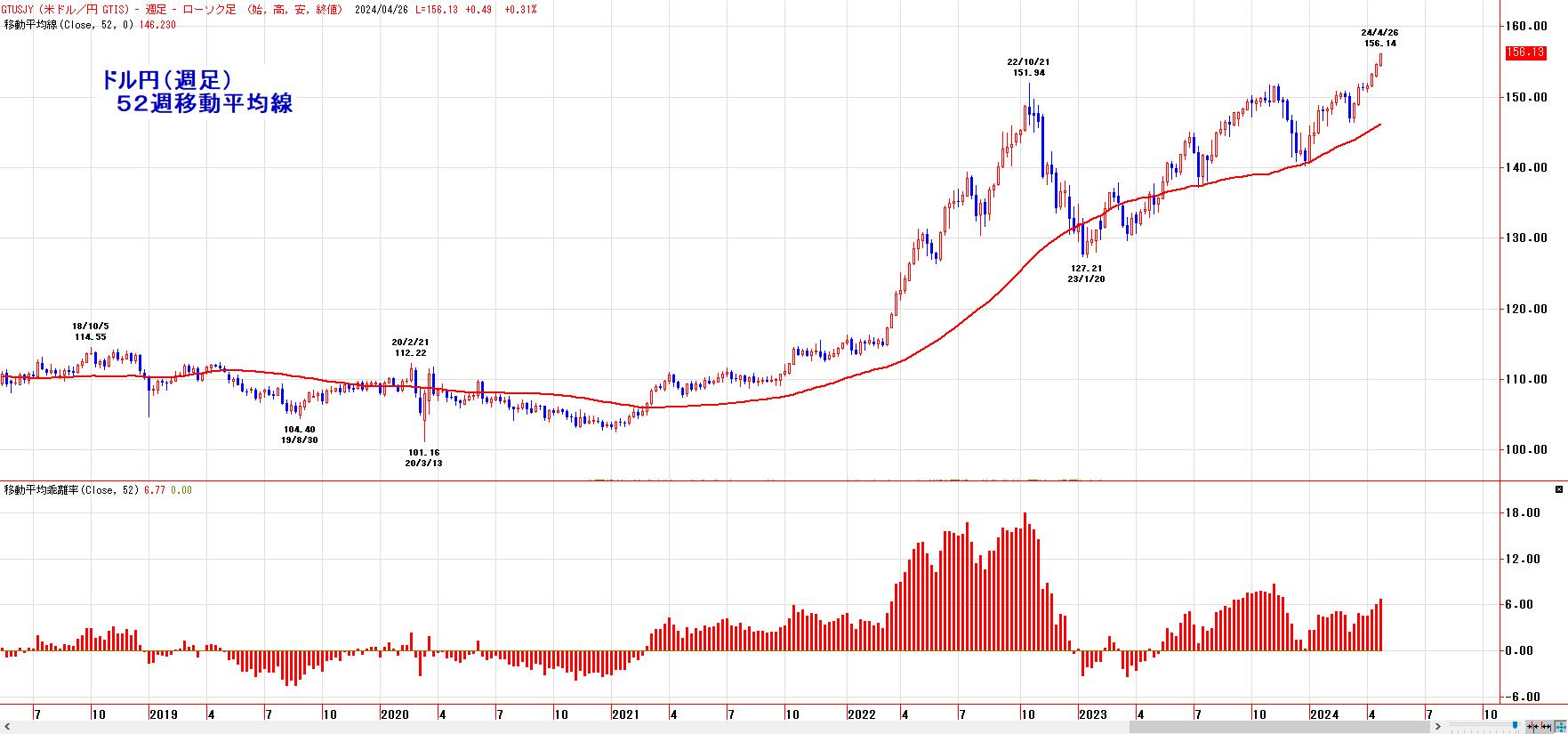 2024/04/26 ドル円、前回介入時と比べるとテクニカル的な過熱感低い ドル円は156円突破も、前回介入時と比べると52週移動平均線との乖離率は、依然として低い。 投機的な過熱感を理由とした介入を実施し難い理由の一つ。 「チャートワンポイント」カテゴリの最新記事 < 前の記事次の記事 >